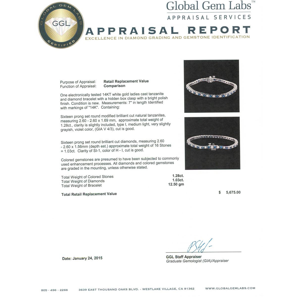 One electronically tested 14KT white gold ladies cast tanzanite and diamond bracelet with a hidden box clasp with a bright polish finish. Measurements: 7" in length Identified with markings of "14K". Condition is new. Containing: Sixteen prong set round modified brilliant cut natural tanzanites, measuring 2.60 - 2.60 x 1.69 mm,approximate total weight of 1.28ct., clarity is slightly included, type I, medium light, very slightly grayish, violet color, (GIA V 4/3), cut is good. Sixteen prong set round brilliant cut diamonds, measuring 2.60 - 2.60 x 1.56mm (depth est.) approximate total weight of 16 Stones = 1.03ct. Clarity: SI-1. Color: H - I, Cut is Good. Colored gemstones are presumed to have been subjected to commonly used enhancement processes. All diamonds and colored gemstones are graded in the mounting, unless otherwise stated. Total Weight of Colored Stones 1.28ct. Total Weight of Diamonds 1.03ct. Total Weight of Bracelet 12.50 grams. GGL Appraised at $5,675.00.