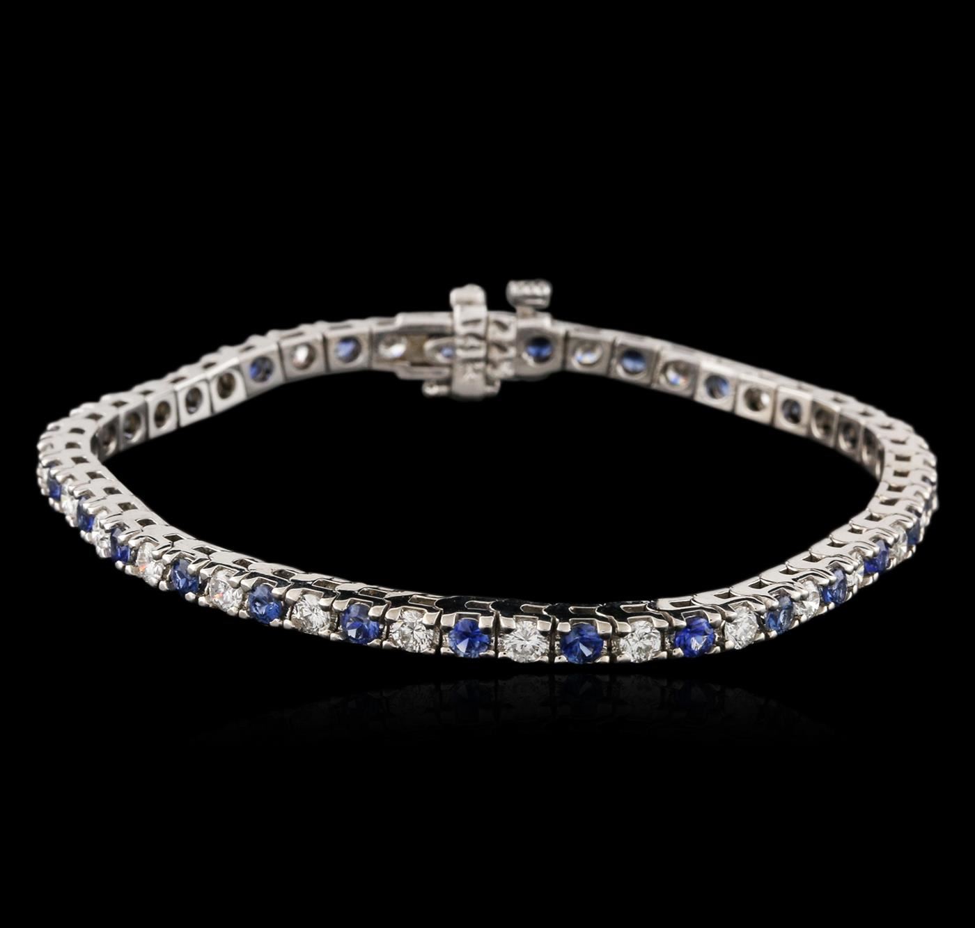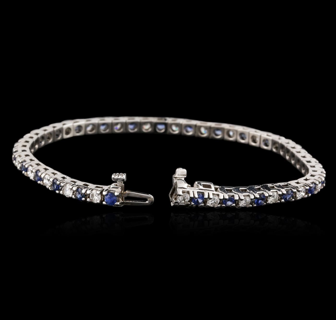 One electronically tested 14KT white gold ladies cast tanzanite and diamond bracelet with a hidden box clasp with a bright polish finish. Measurements: 7" in length Identified with markings of "14K". Condition is new. Containing: Sixteen prong set round modified brilliant cut natural tanzanites, measuring 2.60 - 2.60 x 1.69 mm,approximate total weight of 1.28ct., clarity is slightly included, type I, medium light, very slightly grayish, violet color, (GIA V 4/3), cut is good. Sixteen prong set round brilliant cut diamonds, measuring 2.60 - 2.60 x 1.56mm (depth est.) approximate total weight of 16 Stones = 1.03ct. Clarity: SI-1. Color: H - I, Cut is Good. Colored gemstones are presumed to have been subjected to commonly used enhancement processes. All diamonds and colored gemstones are graded in the mounting, unless otherwise stated. Total Weight of Colored Stones 1.28ct. Total Weight of Diamonds 1.03ct. Total Weight of Bracelet 12.50 grams. GGL Appraised at $5,675.00.