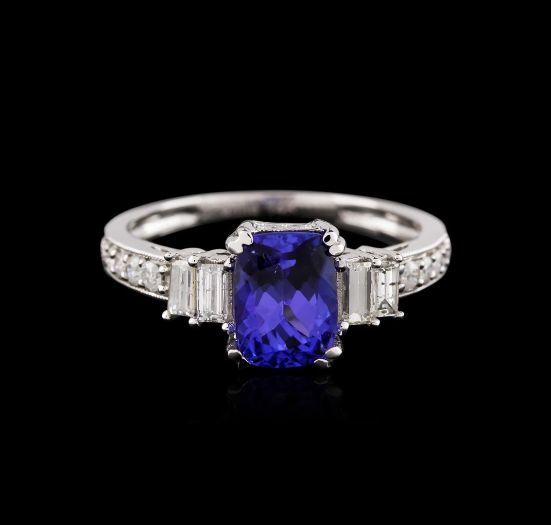 One electronically tested 14KT white gold ladies cast tanzanite and diamond ring with a bright polish finish. Identified with markings of "14K". Condition is new. Containing: One prong set rectangular cushion modified brilliant cut natural tanzanite, measuring 7.92 x 5.90 x 3.48mm, approximate weight of 1.28ct., clarity is eye clean, type I, medium light, very slightly grayish, violet color, (GIA V 4/3), cut is good. Eight prong set round brilliant cut diamonds, measuring 1.50 - 1.50 x 0.90mm (depth est.) approximate total weight of 8 Stones = 0.10ct. Clarity: I-1 to I-2. Color: I - J. Four prong set baguette cut diamonds, measuring 3.50 x 1.50 x 1.28mm (depth est.) approximate total weight of 4 Stones = 0.25ct. Clarity: SI-1 to SI-2. Color: H - I, Cut is Good. Colored gemstones are presumed to have been subjected to commonly used enhancement processes. All diamonds and colored gemstones are graded in the mounting, unless otherwise stated. Total Weight of Colored Stones 1.28ct. Total Weight of Diamonds 0.34ct. Total Weight of Ring 3.20 grams. GGL Appraised at $2,725.00.