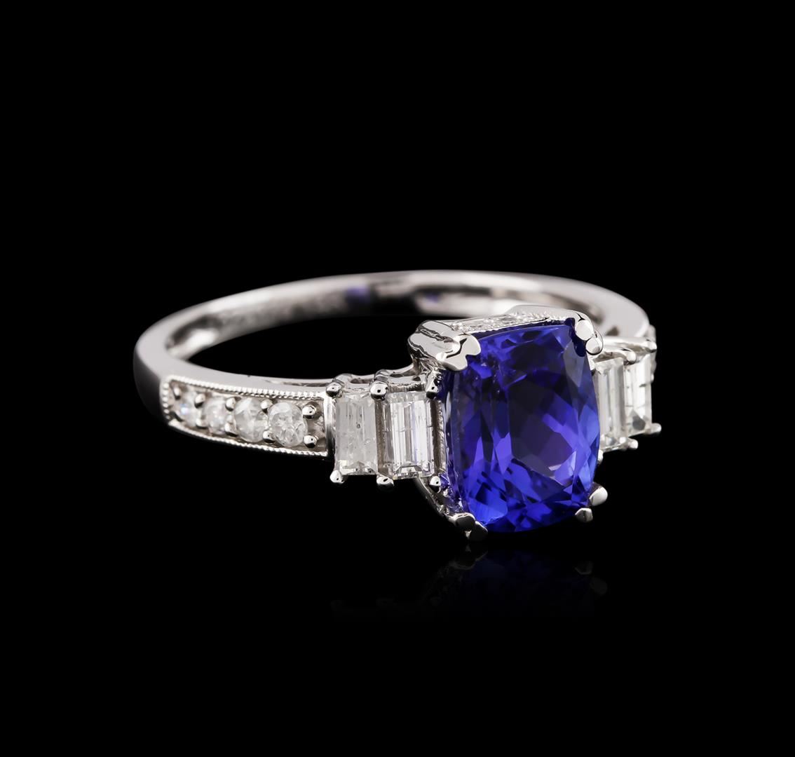 One electronically tested 14KT white gold ladies cast tanzanite and diamond ring with a bright polish finish. Identified with markings of "14K". Condition is new. Containing: One prong set rectangular cushion modified brilliant cut natural tanzanite, measuring 7.92 x 5.90 x 3.48mm, approximate weight of 1.28ct., clarity is eye clean, type I, medium light, very slightly grayish, violet color, (GIA V 4/3), cut is good. Eight prong set round brilliant cut diamonds, measuring 1.50 - 1.50 x 0.90mm (depth est.) approximate total weight of 8 Stones = 0.10ct. Clarity: I-1 to I-2. Color: I - J. Four prong set baguette cut diamonds, measuring 3.50 x 1.50 x 1.28mm (depth est.) approximate total weight of 4 Stones = 0.25ct. Clarity: SI-1 to SI-2. Color: H - I, Cut is Good. Colored gemstones are presumed to have been subjected to commonly used enhancement processes. All diamonds and colored gemstones are graded in the mounting, unless otherwise stated. Total Weight of Colored Stones 1.28ct. Total Weight of Diamonds 0.34ct. Total Weight of Ring 3.20 grams. GGL Appraised at $2,725.00.