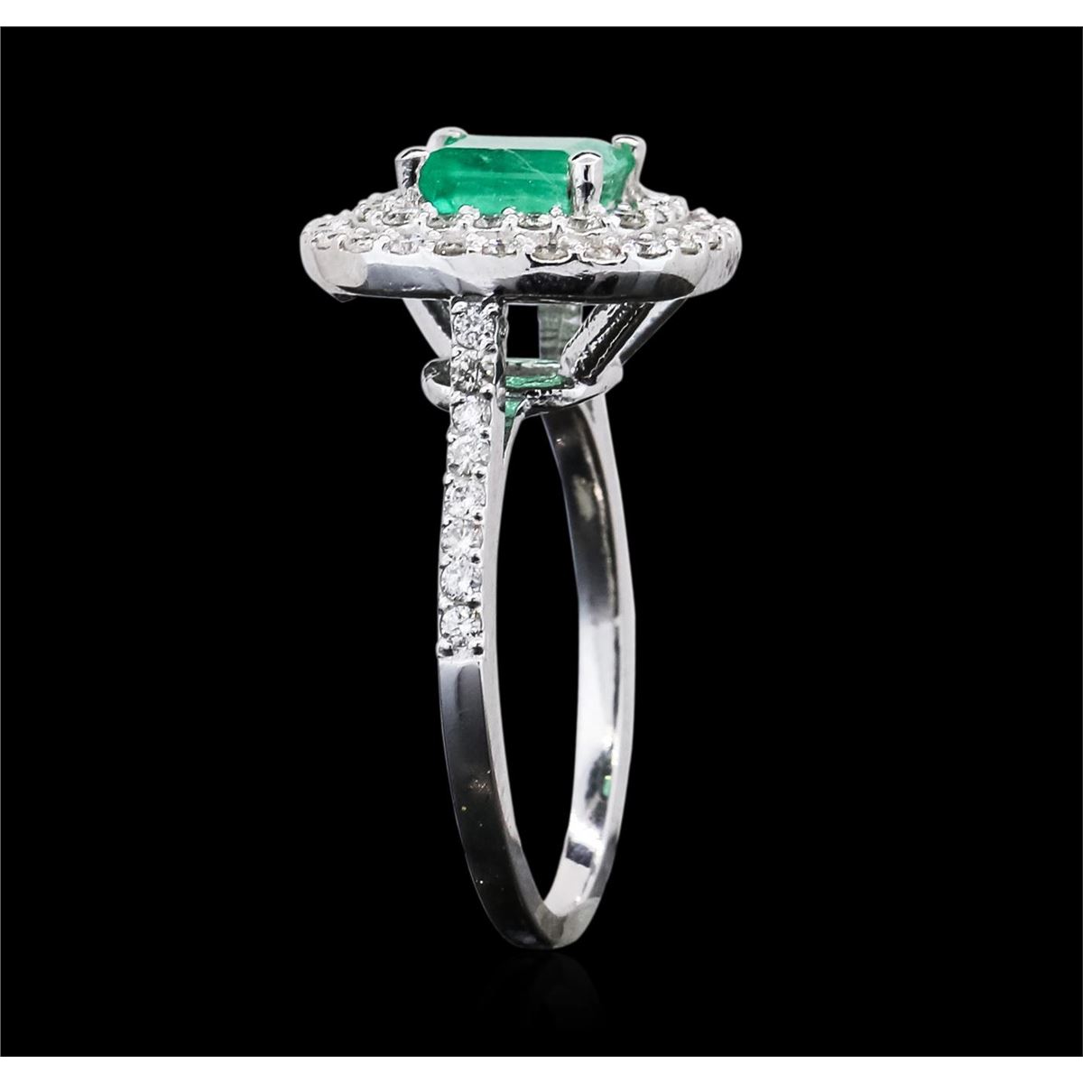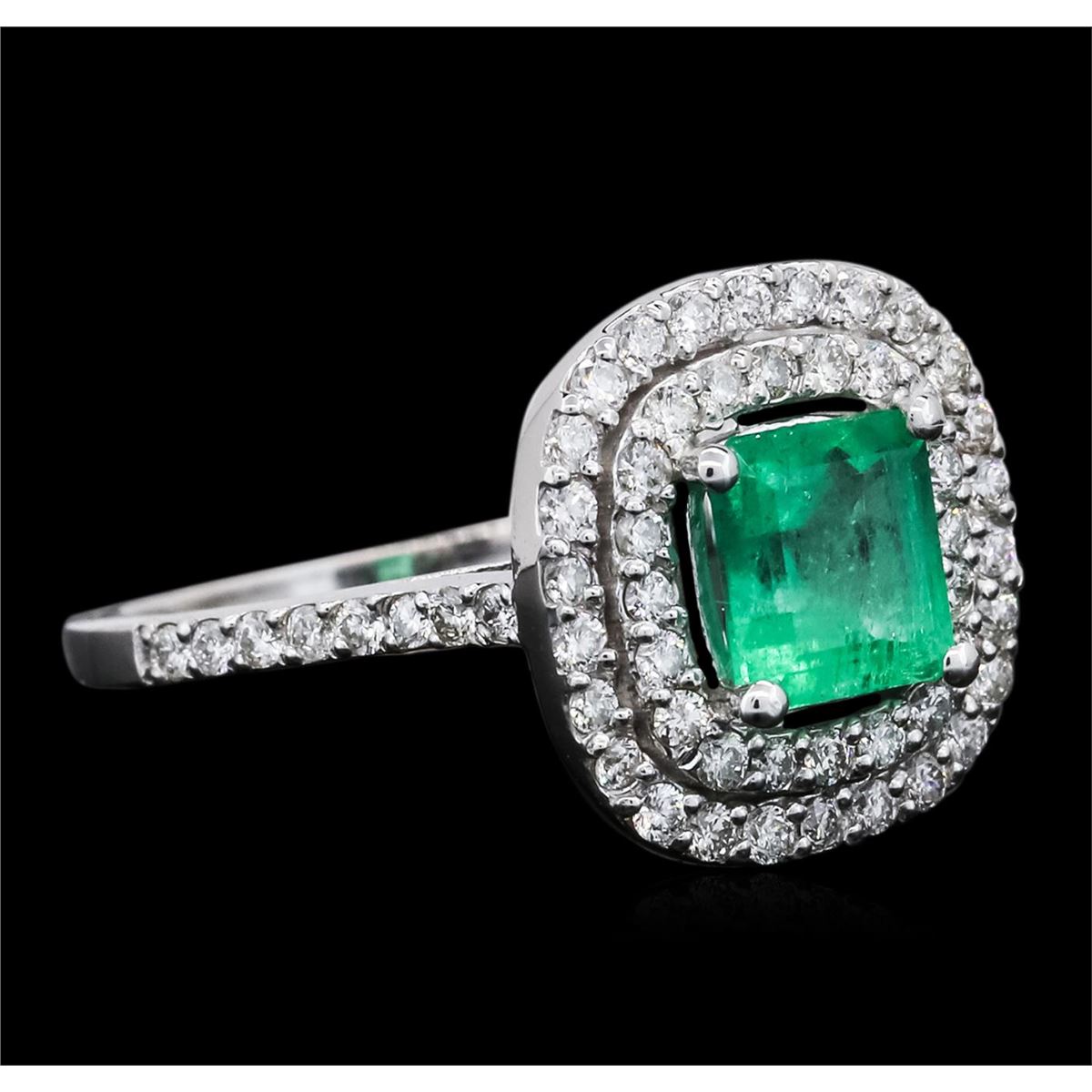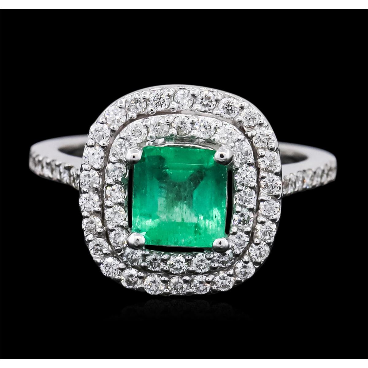 One electronically tested 14KT white gold ladies cast emerald and diamond ring with a bright polish finish. The featured emerald is set within two tiered diamond bezel supported by diamond set shoulders, completed by one and one-half millimeter wide band. Condition is new, good workmanship. Containing: One prong set rectangular step cut natural emerald, measuring 6.35 x 5.90 x 3.95mm, 6% bulge factor, approximate weight of 1.28ct., clarity is heavily included, type III, medium dark, very slightly grayish, very slightly bluish green color, (GIA vslbG 6/3), cut is good. Transmitting light with a minimum of distortion, transparent. Naturally occurring internal & external characteristics are present. Indications of multiple laboratory enhancements, including oil residue. Graded in the setting. Sixty-Two prong set round brilliant cut diamonds, measuring 1.50 - 1.40 x 0.87mm (depth est.) approximate total weight of 62 Stones = 0.78ct. Graded in the setting. Clarity: SI-1 to I-1. Color: G - I. Total Weight of Colored Stones 1.28ct. Total Weight of Diamonds 0.78ct. Total Weight of Ring 4.61 grams. AIG Appraised at $4,540.00.