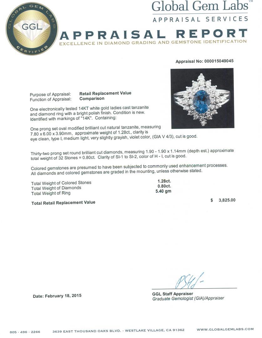 One electronically tested 14KT white gold ladies cast tanzanite and diamond ring with a bright polish finish. Identified with markings of "14K". Condition is new. Containing: One prong set oval modified brilliant cut natural tanzanite, measuring 7.80 x 6.00 x 3.90mm, approximate weight of 1.28ct., clarity is eye clean, type I, medium light, very slightly grayish, violet color, (GIA V 4/3), cut is good. Thirty-Two prong set round brilliant cut diamonds, measuring 1.90 - 1.90 x 1.14mm (depth est.) approximate total weight of 32 Stones = 0.80ct. Clarity: SI-1 to SI-2. Color: H - I, Cut is Good. Colored gemstones are presumed to have been subjected to commonly used enhancement processes. All diamonds and colored gemstones are graded in the mounting, unless otherwise stated. Total Weight of Colored Stones 1.28ct. Total Weight of Diamonds 0.80ct. Total Weight of Ring 5.40 grams. GGL Appraised at $3,825.00.