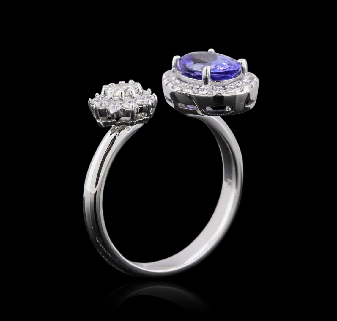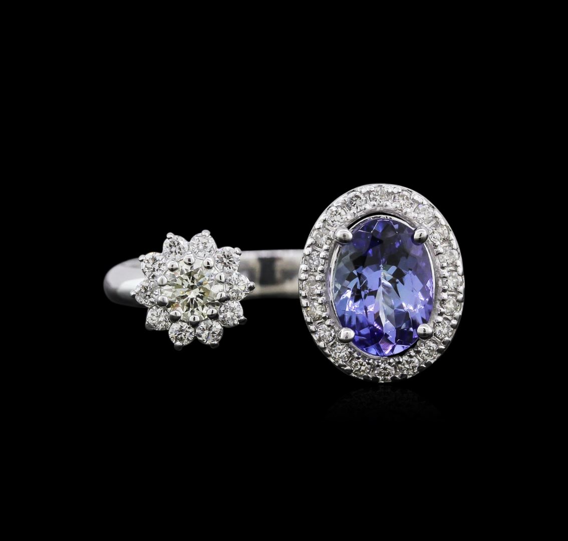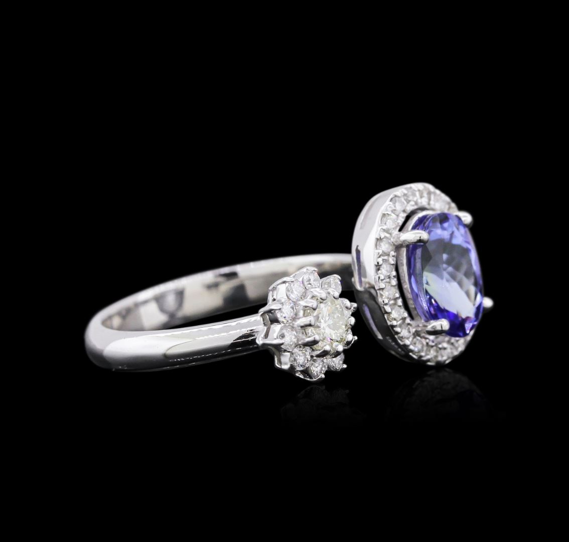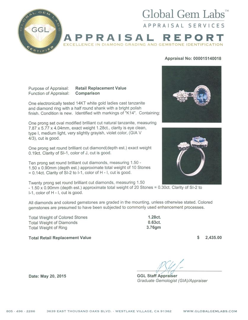 One electronically tested 14KT white gold ladies cast tanzanite and diamond ring with a half round shank with a bright polish finish. Identified with markings of "K14". Condition is new. Containing: One prong set oval modified brilliant cut natural tanzanite, measuring 7.87 x 5.77 x 4.04mm, exact weight 1.28ct., clarity is eye clean, type I, medium light, very slightly grayish, violet color, (GIA V 4/3), cut is good. One prong set round brilliant cut diamond(depth est.) exact weight 0.19ct. Clarity: SI-1. Color: J, Cut is Good. Ten prong set round brilliant cut diamonds, measuring 1.50 - 1.50 x 0.90mm (depth est.) approximate total weight of 10 Stones = 0.14ct. Clarity: SI-2 to I-1. Color: H - I, Cut is Good. Twenty prong set round brilliant cut diamonds, measuring 1.50 - 1.50 x 0.90mm (depth est.) approximate total weight of 20 Stones = 0.30ct. Clarity: SI-2 to I-1. Color: H - I, Cut is Good. All diamonds and colored gemstones are graded in the mounting, unless otherwise stated. Colored gemstones are presumed to have been subjected to commonly used enhancement processes. Total Weight of Colored Stones 1.28ct. Total Weight of Diamonds 0.63ct. Total Weight of Ring 3.76 grams. GGL Appraised at $2,435.00.
