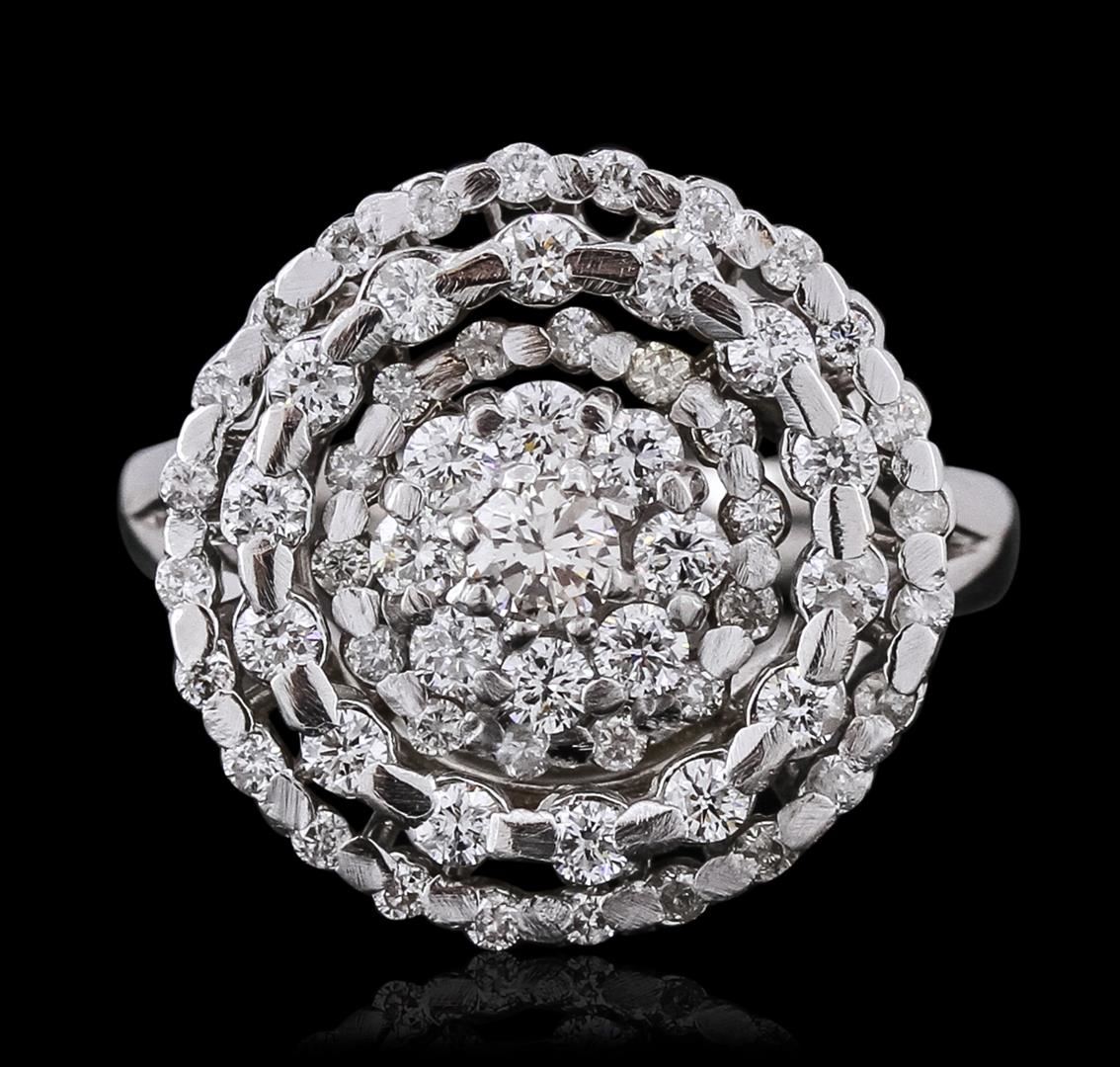 One electronically tested 14KT white gold ladies cast diamond ring with a bright polish finish. The ring features a multi-tier diamond cluster, completed by a two and one-half millimeter wide band. Identified with markings of "K14". Condition is new, good workmanship. Containing: One prong set round brilliant cut diamond, measuring 3.40 - 3.35 x 2.03mm (depth est.) approximate weight of 0.15ct. Graded in the setting. Clarity: SI-2. Color: J Twenty-Two prong set round brilliant cut diamonds, measuring 2.00 - 1.90 x 1.17mm (depth est.) approximate total weight of 22 Stones = 0.69ct. Graded in the setting. Clarity: SI-1 to SI-2. Color: G - I Thirty-Eight prong set round brilliant cut diamonds, measuring 1.40 - 1.30 x 0.81mm (depth est.) approximate total weight of 38 Stones = 0.44ct. Graded in the setting. Clarity: SI-1 to I-1. Color: H - J. Total Weight of Diamonds 1.28ct. Total Weight of Ring 7.46 grams. AIG Appraised at $5,425.00.