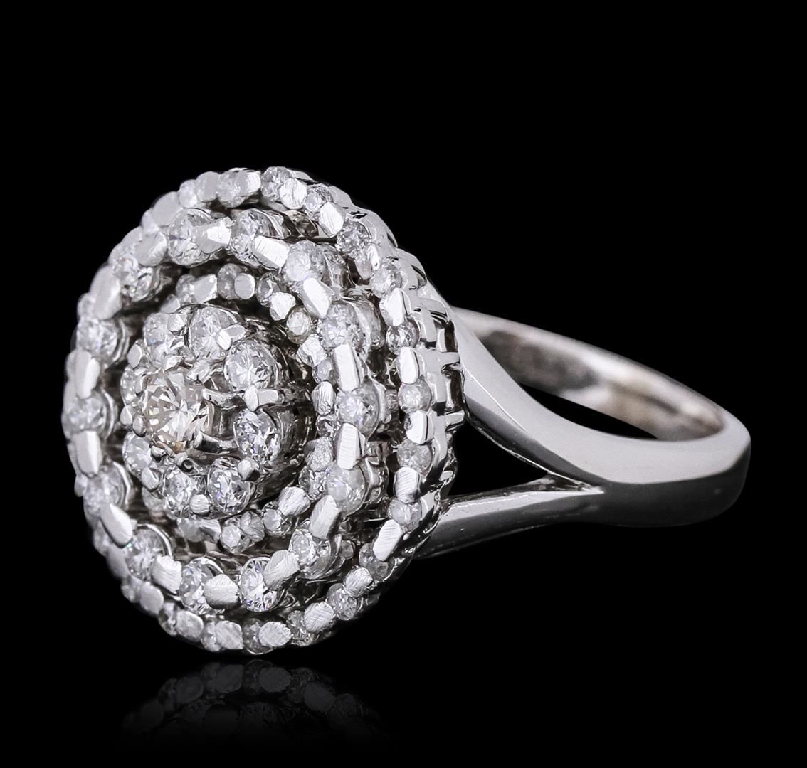 One electronically tested 14KT white gold ladies cast diamond ring with a bright polish finish. The ring features a multi-tier diamond cluster, completed by a two and one-half millimeter wide band. Identified with markings of "K14". Condition is new, good workmanship. Containing: One prong set round brilliant cut diamond, measuring 3.40 - 3.35 x 2.03mm (depth est.) approximate weight of 0.15ct. Graded in the setting. Clarity: SI-2. Color: J Twenty-Two prong set round brilliant cut diamonds, measuring 2.00 - 1.90 x 1.17mm (depth est.) approximate total weight of 22 Stones = 0.69ct. Graded in the setting. Clarity: SI-1 to SI-2. Color: G - I Thirty-Eight prong set round brilliant cut diamonds, measuring 1.40 - 1.30 x 0.81mm (depth est.) approximate total weight of 38 Stones = 0.44ct. Graded in the setting. Clarity: SI-1 to I-1. Color: H - J. Total Weight of Diamonds 1.28ct. Total Weight of Ring 7.46 grams. AIG Appraised at $5,425.00.