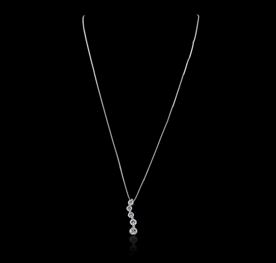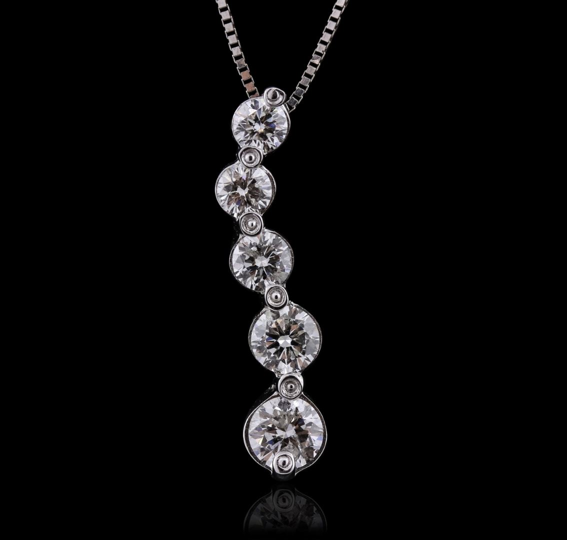 One electronically tested 14KT white gold ladies combination cast & assembled pendant & chain 16.0" long, light box link with a spring ring clasp with a bright polish finish. Condition is new. Identified with markings of "14K". Containing: One prong set round brilliant cut diamond, measuring 5.00 - 5.00 x 3.00mm (depth est.) approximate weight of 0.46ct. Clarity: I-1. Color: J, Cut is Good. One prong set round brilliant cut diamond, measuring 4.30 - 4.30 x 2.58mm (depth est.) approximate weight of 0.29ct. Clarity: SI-1. Color: J, Cut is Good. Three prong set round brilliant cut diamonds, measuring 3.80 - 3.50 x 2.19mm (depth est.) approximate. Total Weight of 3 Stones = 0.53ct. Clarity: SI-1 to SI-2. Color: J, Cut is Good. All diamonds are graded in the mounting, unless otherwise stated. Total Weight of Diamonds 1.28ct. Total Weight of Pendant & Chain 3.80 grams. GGL Appraised at $5,660.00.
