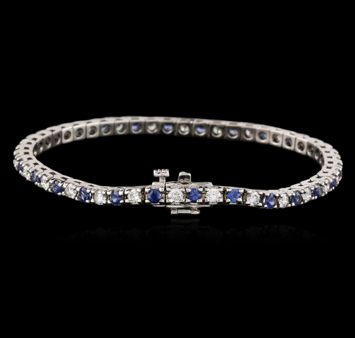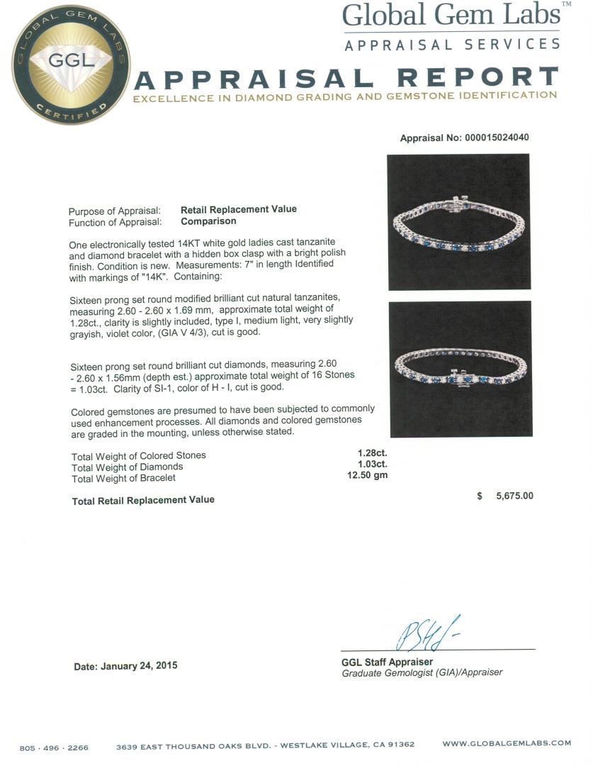 One electronically tested 14KT white gold ladies cast tanzanite and diamond bracelet with a hidden box clasp with a bright polish finish. Measurements: 7" in length Identified with markings of "14K". Condition is new. Containing: Sixteen prong set round modified brilliant cut natural tanzanites, measuring 2.60 - 2.60 x 1.69 mm,approximate total weight of 1.28ct., clarity is slightly included, type I, medium light, very slightly grayish, violet color, (GIA V 4/3), cut is good. Sixteen prong set round brilliant cut diamonds, measuring 2.60 - 2.60 x 1.56mm (depth est.) approximate total weight of 16 Stones = 1.03ct. Clarity: SI-1. Color: H - I, Cut is Good. Colored gemstones are presumed to have been subjected to commonly used enhancement processes. All diamonds and colored gemstones are graded in the mounting, unless otherwise stated. Total Weight of Colored Stones 1.28ct. Total Weight of Diamonds 1.03ct. Total Weight of Bracelet 12.50 grams. GGL Appraised at $5,675.00.