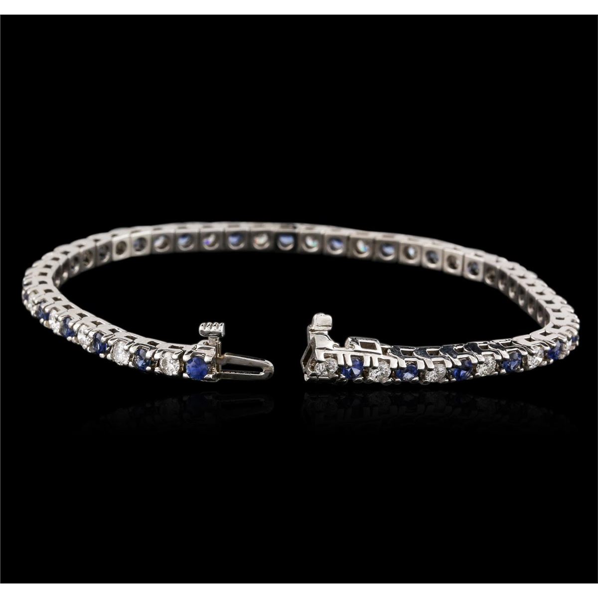 One electronically tested 14KT white gold ladies cast tanzanite and diamond bracelet with a hidden box clasp with a bright polish finish. Measurements: 7" in length Identified with markings of "14K". Condition is new. Containing: Sixteen prong set round modified brilliant cut natural tanzanites, measuring 2.60 - 2.60 x 1.69 mm,approximate total weight of 1.28ct., clarity is slightly included, type I, medium light, very slightly grayish, violet color, (GIA V 4/3), cut is good. Sixteen prong set round brilliant cut diamonds, measuring 2.60 - 2.60 x 1.56mm (depth est.) approximate total weight of 16 Stones = 1.03ct. Clarity: SI-1. Color: H - I, Cut is Good. Colored gemstones are presumed to have been subjected to commonly used enhancement processes. All diamonds and colored gemstones are graded in the mounting, unless otherwise stated. Total Weight of Colored Stones 1.28ct. Total Weight of Diamonds 1.03ct. Total Weight of Bracelet 12.50 grams. GGL Appraised at $5,675.00.