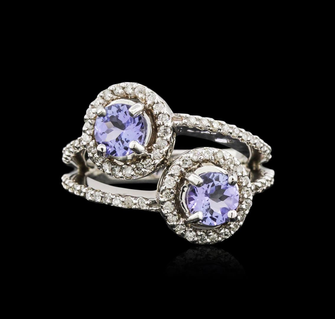 One electronically tested 14KT white gold ladies cast tanzanite and diamond ring with a bright polish finish. The ring features two tanzanite set within a diamond bezel supported by diamond set shoulders, completed by a three millimeter wide band. Identified with markings of "K14". Condition is new, good workmanship. Containing: Two prong set round brilliant cut natural tanzanites, measuring 5.50 - 5.40 x 3.00 mm, 6% bulge factor, approximate total weight of 1.28ct., clarity is eye clean, type I, medium dark, very slightly grayish, bluish violet color, (GIA bV 6/3), cut is good. Transmitting light with no distortion, transparent. Color grade is an average for the group. Graded in the setting. Eighty prong set round brilliant cut diamonds, measuring 1.20 - 1.10 x 0.69mm (depth est.) approximate total weight of 80 Stones = 0.54ct. Graded in the setting. Clarity: SI-1 to I-1. Color: H - J. Total Weight of Colored Stones 1.28ct. Total Weight of Diamonds 0.54ct. Total Weight of Ring 6.44 grams. AIG Appraised at $4,940.00.