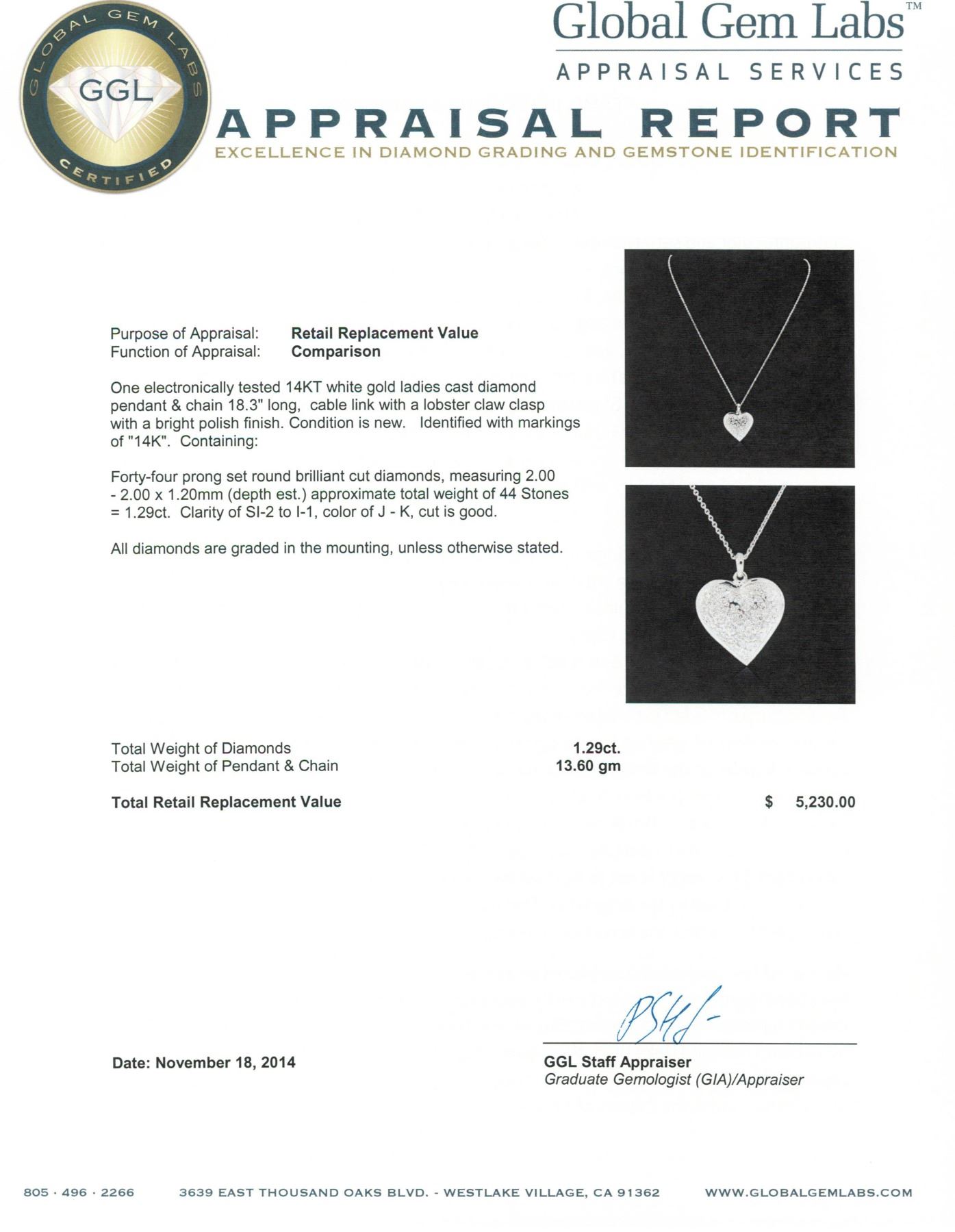 One electronically tested 14KT white gold ladies cast diamond pendant & chain 18.3" long, cable link with a lobster claw clasp with a bright polish finish. Identified with markings of "14K". Condition is new. Containing: Forty-Four prong set round brilliant cut diamonds, measuring 2.00 - 2.00 x 1.20mm (depth est.) approximate total weight of 44 Stones = 1.29ct. Clarity: SI-2 to I-1. Color: J - K, Cut is Good. All diamonds are graded in the mounting, unless otherwise stated. Total Weight of Diamonds 1.29ct. Total Weight of Pendant & Chain 13.60 grams. GGL Appraised.