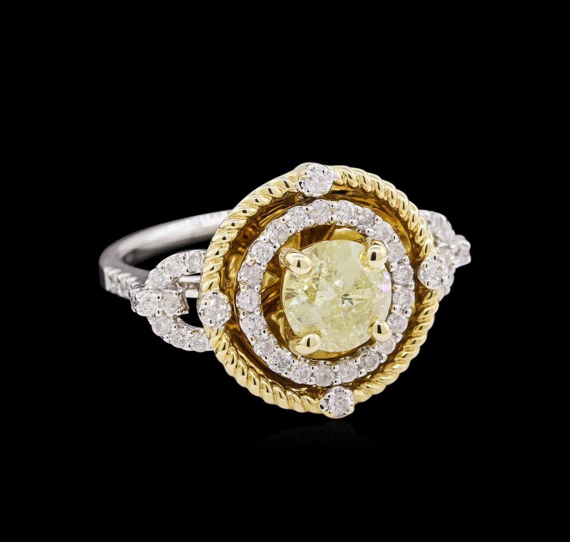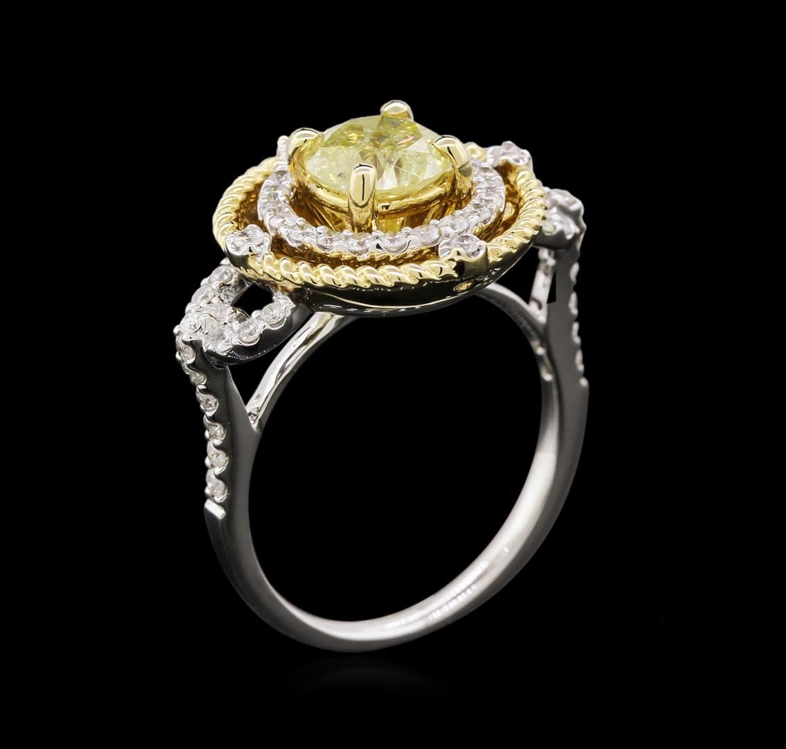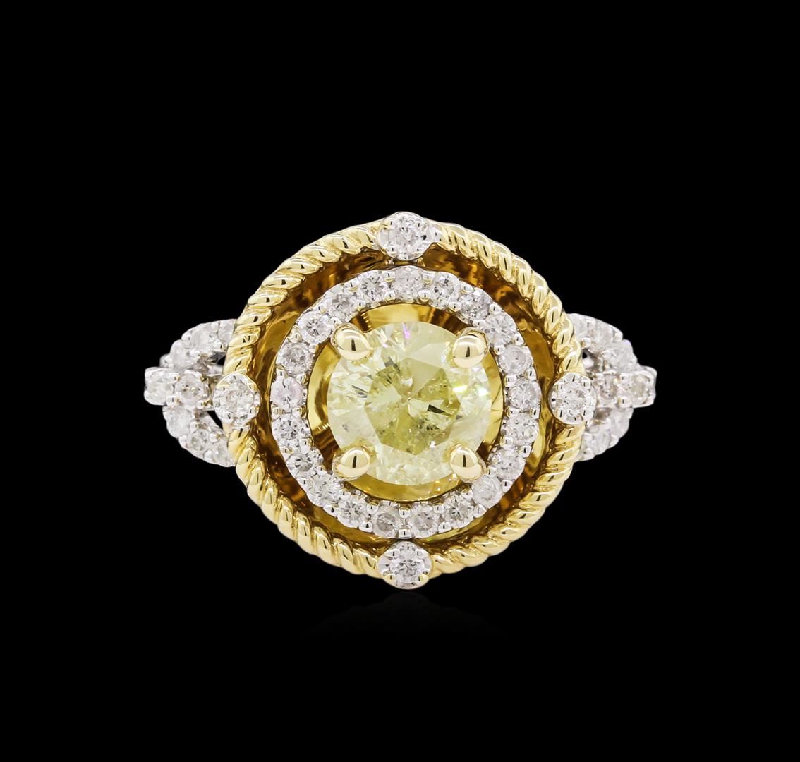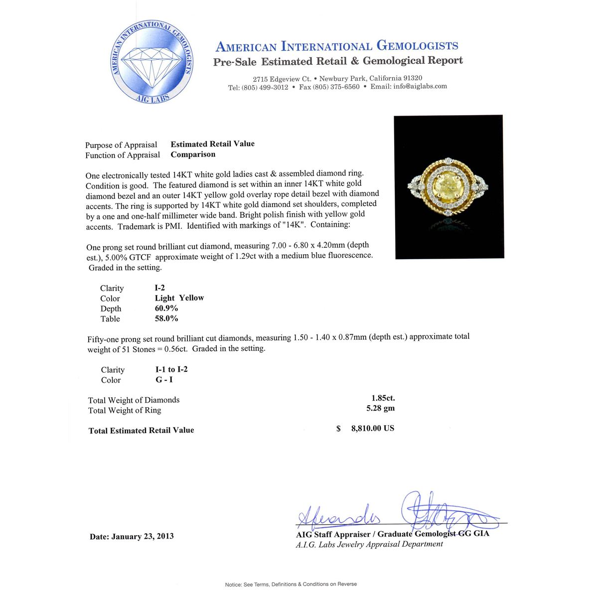 One electronically tested 14KT white gold ladies cast & assembled diamond ring. Condition is good. The featured diamond is set within an inner 14KT white gold diamond bezel and an outer 14KT yellow gold overlay rope detail bezel with diamond accents. The ring is supported by 14KT white gold diamond set shoulders, completed by a one and one-half millimeter wide band. Bright polish finish with yellow gold accents. Trademark is PMI. Identified with markings of "14K". Containing: one prong set round brilliant cut diamond, measuring 7.00 -- 6.80 x 4.20mm (depth est.) 5.00% GTCF approximate weight of 1.29ct with a medium blue fluorescence. Graded in the setting. Clarity I-2. Color Light Yellow. Depth 60.9%. Table 58.0%. Fifty-one prong set round brilliant cut diamonds, measuring 1.50 -- 1.40 x 0.87mm (depth est.) approximate total weight of 51 stones = 0.56ct. Graded in the setting. Clarity I-1 to I-2. Color G-I. Total weight of Diamonds 1.85ct. Total weight of Ring 5.28gm. AIG Appraised at $8,810.00.