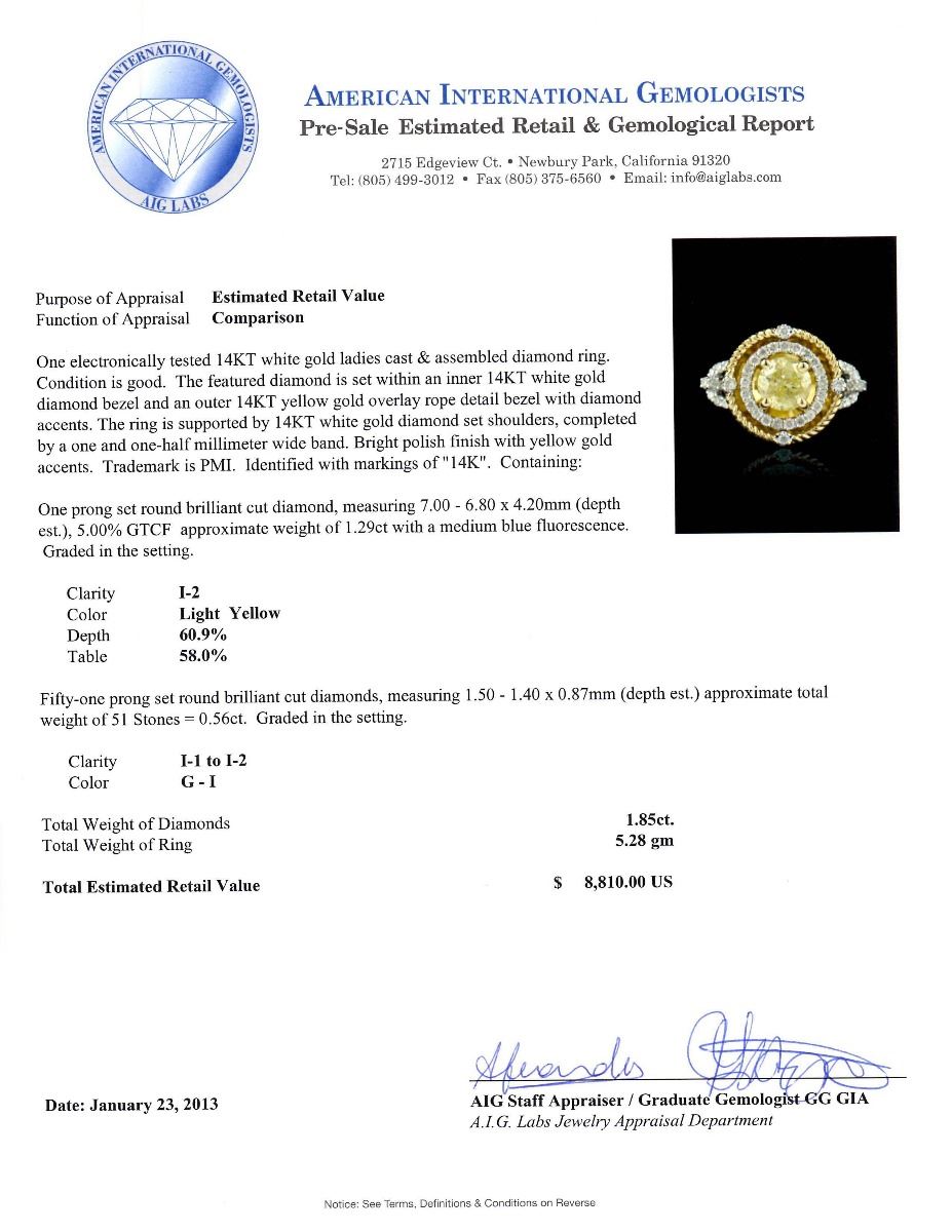 One electronically tested 14KT white gold ladies cast & assembled diamond ring. Condition is good. The featured diamond is set within an inner 14KT white gold diamond bezel and an outer 14KT yellow gold overlay rope detail bezel with diamond accents. The ring is supported by 14KT white gold diamond set shoulders, completed by a one and one-half millimeter wide band. Bright polish finish with yellow gold accents. Trademark is PMI. Identified with markings of "14K". Containing: one prong set round brilliant cut diamond, measuring 7.00 -- 6.80 x 4.20mm (depth est.) 5.00% GTCF approximate weight of 1.29ct with a medium blue fluorescence. Graded in the setting. Clarity I-2. Color Light Yellow. Depth 60.9%. Table 58.0%. Fifty-one prong set round brilliant cut diamonds, measuring 1.50 -- 1.40 x 0.87mm (depth est.) approximate total weight of 51 stones = 0.56ct. Graded in the setting. Clarity I-1 to I-2. Color G-I. Total weight of Diamonds 1.85ct. Total weight of Ring 5.28gm. AIG Appraised at $8,810.00.