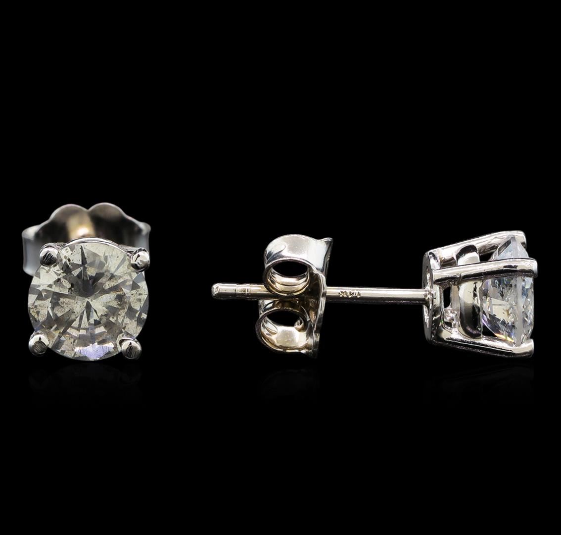 One pair electronically tested 14KT white gold ladies cast diamond stud earrings with friction posts with a bright polish finish. Identified with markings of "14K". Condition is new. Containing: Two prong set round brilliant cut diamonds, measuring 5.60 - 5.60 x 3.38mm (depth est.) approximate total weight of 2 Stones = 1.29ct. Clarity: I-2 to I-3. Color: J, Cut is Good. Diamonds are graded in the mounting, unless otherwise stated. Total Weight of Diamonds 1.29ct. Total Weight of Stud Earrings 1.20 grams. GGL Appraised at $2,475.00.