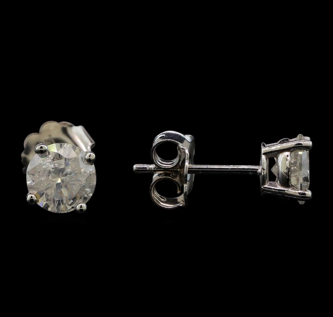 One pair electronically tested 14KT white gold ladies cast diamond stud earrings with friction posts with a bright polish finish. Identified with markings of "14K". Condition is new. Containing: Two prong set round brilliant cut diamonds, measuring 5.60 - 5.60 x 3.38mm (depth est.) approximate total weight of 2 Stones = 1.29ct. Clarity: I-3 to I-3. Color: I, Cut is Good. Diamonds are graded in the mounting, unless otherwise stated. Total Weight of Diamonds 1.29ct. Total Weight of Stud Earrings 1.00 grams. GGL Appraised at $1,885.00.