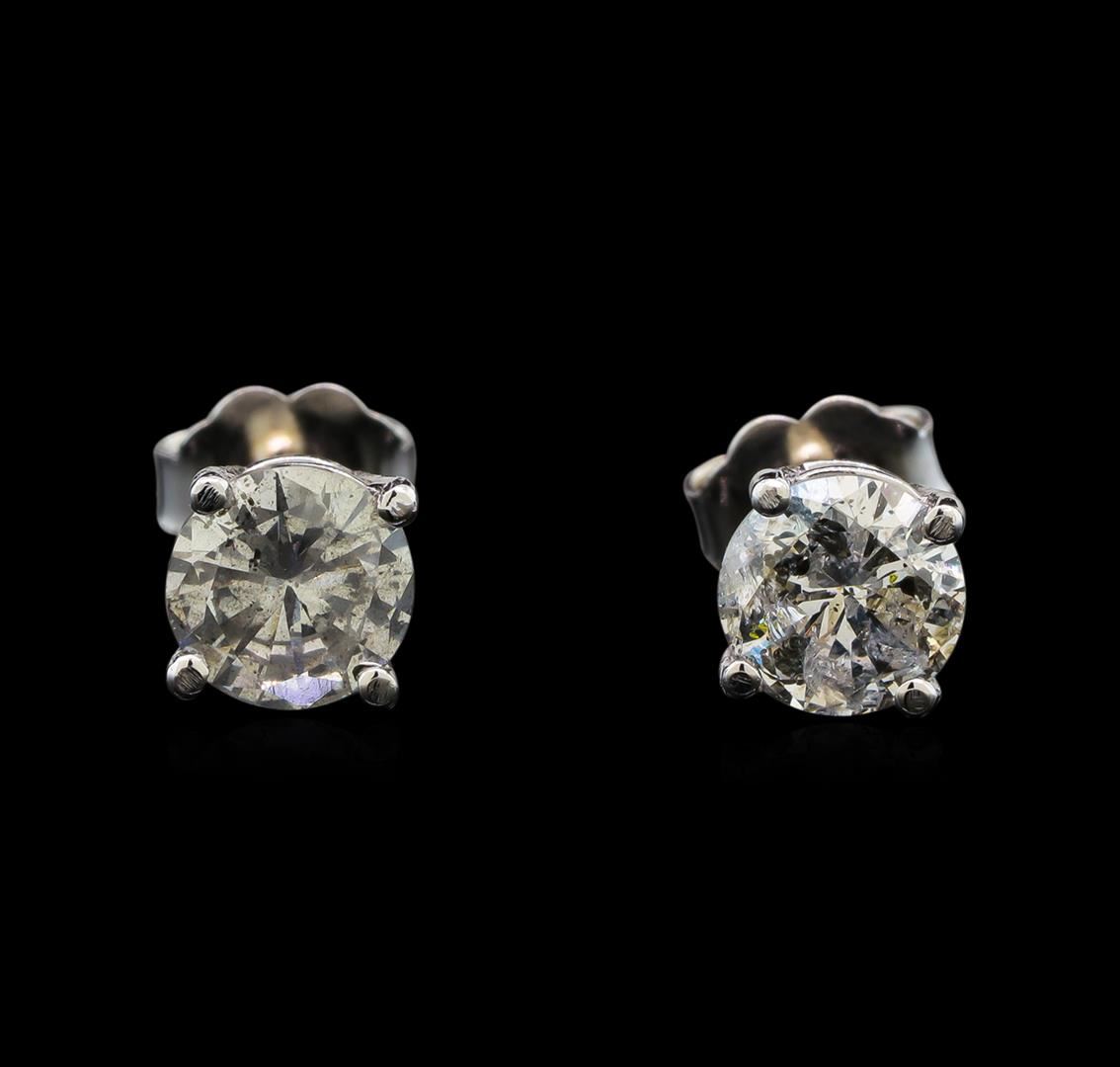 One pair electronically tested 14KT white gold ladies cast diamond stud earrings with friction posts with a bright polish finish. Identified with markings of "14K". Condition is new. Containing: Two prong set round brilliant cut diamonds, measuring 5.60 - 5.60 x 3.38mm (depth est.) approximate total weight of 2 Stones = 1.29ct. Clarity: I-2 to I-3. Color: J, Cut is Good. Diamonds are graded in the mounting, unless otherwise stated. Total Weight of Diamonds 1.29ct. Total Weight of Stud Earrings 1.20 grams. GGL Appraised at $2,475.00.