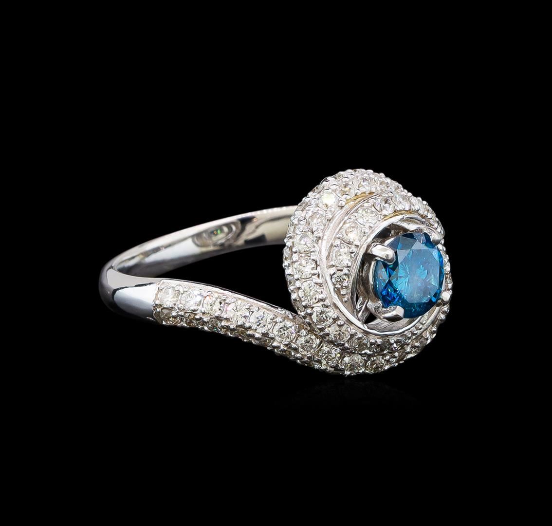 One electronically tested 14KT white gold ladies cast diamond engagement ring with a bright polish finish. Identified with markings of "14K". Condition is new. Containing: One prong set round brilliant cut diamond, measuring 5.34 - 5.34 x 3.20mm (depth est.) approximate weight of 0.56ct. Clarity: I-2, Cut is Good. The color of the stone has been treated. Ninety-One prong set round brilliant cut diamonds, measuring 1.30 - 1.30 x 0.78mm (depth est.) approximate total weight of 91 Stones = 0.73ct. Clarity: SI-2 to I-2. Color: H - I, Cut is Good. All diamonds are graded in the mounting, unless otherwise stated. Total Weight of Diamonds 1.29ct. Total Weight of Engagement Ring 5.20 grams. GGL Appraised at $4,295.00.