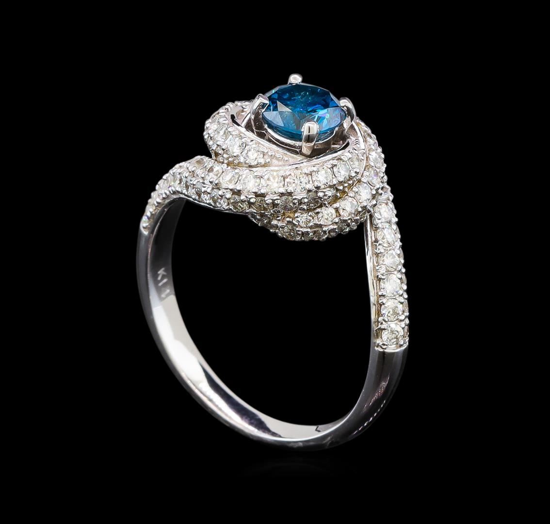 One electronically tested 14KT white gold ladies cast diamond engagement ring with a bright polish finish. Identified with markings of "14K". Condition is new. Containing: One prong set round brilliant cut diamond, measuring 5.34 - 5.34 x 3.20mm (depth est.) approximate weight of 0.56ct. Clarity: I-2, Cut is Good. The color of the stone has been treated. Ninety-One prong set round brilliant cut diamonds, measuring 1.30 - 1.30 x 0.78mm (depth est.) approximate total weight of 91 Stones = 0.73ct. Clarity: SI-2 to I-2. Color: H - I, Cut is Good. All diamonds are graded in the mounting, unless otherwise stated. Total Weight of Diamonds 1.29ct. Total Weight of Engagement Ring 5.20 grams. GGL Appraised at $4,295.00.