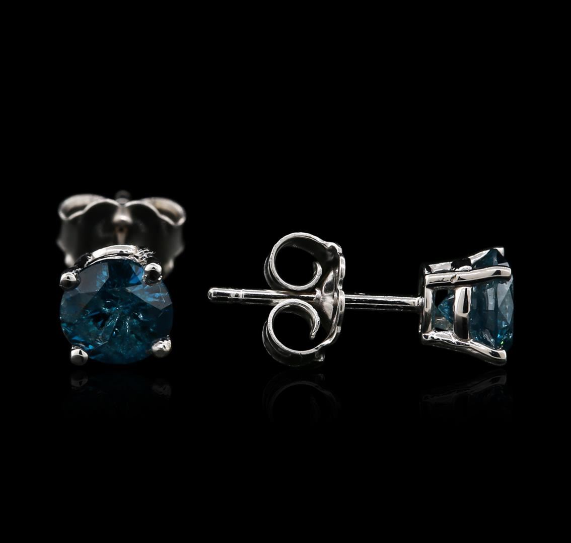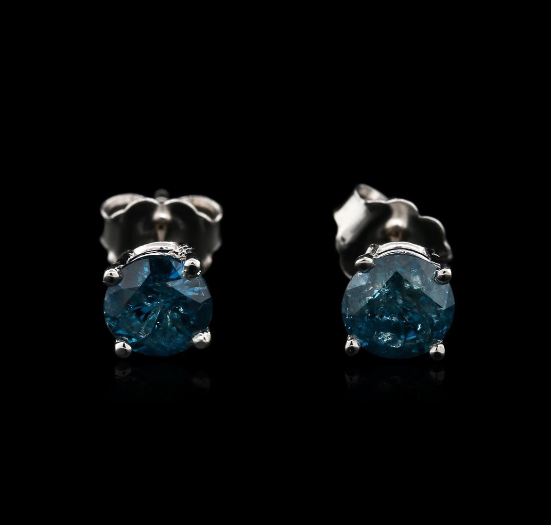 One pair electronically tested 14KT white gold ladies cast diamond stud earrings with friction posts with a bright polish finish. Identified with markings of "14K". Condition is new. Containing: Two prong set round brilliant cut diamonds, measuring 5.60 - 5.60 x 3.36mm (depth est.) approximate total weight of 2 Stones = 1.29ct. Clarity: I-2 to I-3, Cut is Good. Color of the stones has been treated. Diamonds are graded in the mounting, unless otherwise stated. Total Weight of Diamonds 1.29ct. Total Weight of Stud Earrings 1.00 grams. GGL Appraised at $1,760.00.