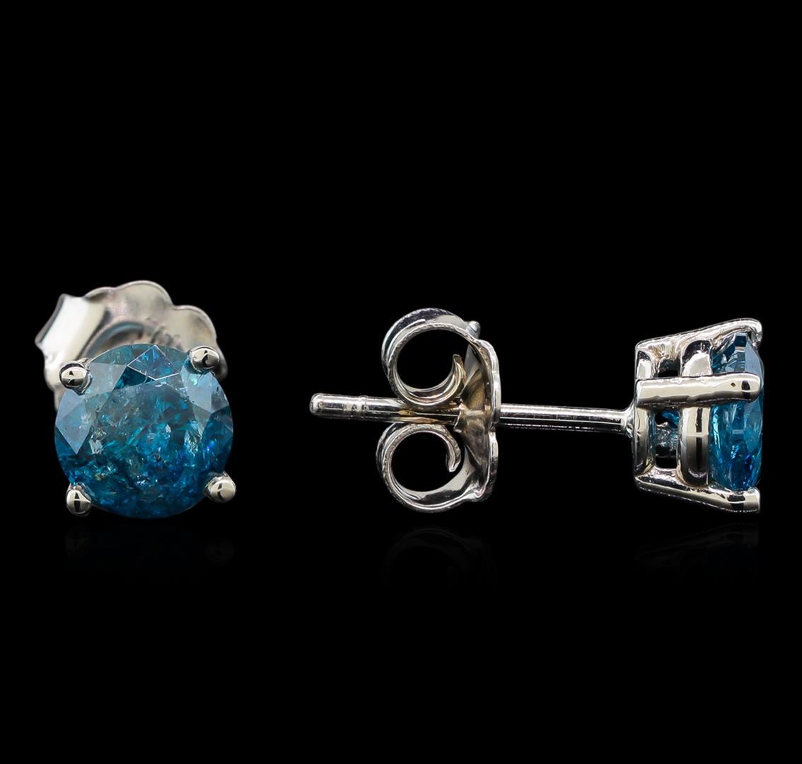 One pair electronically tested 14KT white gold ladies cast diamond stud earrings with friction posts with a bright polish finish. Identified with markings of "14K". Condition is new. Containing: Two prong set round brilliant cut diamonds, measuring 5.60 - 5.60 x 3.36mm (depth est.) approximate total weight of 2 Stones = 1.29ct. Clarity: I-2 to I-3, Cut is Good. Color of the stones has been treated. Diamonds are graded in the mounting, unless otherwise stated. Total Weight of Diamonds 1.29ct. Total Weight of Stud Earrings 1.00 grams. GGL Appraised at $1,760.00.