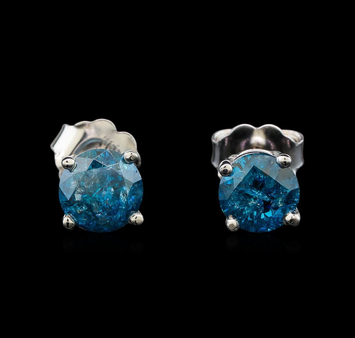 One pair electronically tested 14KT white gold ladies cast diamond stud earrings with friction posts with a bright polish finish. Identified with markings of "14K". Condition is new. Containing: Two prong set round brilliant cut diamonds, measuring 5.60 - 5.60 x 3.36mm (depth est.) approximate total weight of 2 Stones = 1.29ct. Clarity: I-2 to I-3, Cut is Good. Color of the stones has been treated. Diamonds are graded in the mounting, unless otherwise stated. Total Weight of Diamonds 1.29ct. Total Weight of Stud Earrings 1.00 grams. GGL Appraised at $1,760.00.