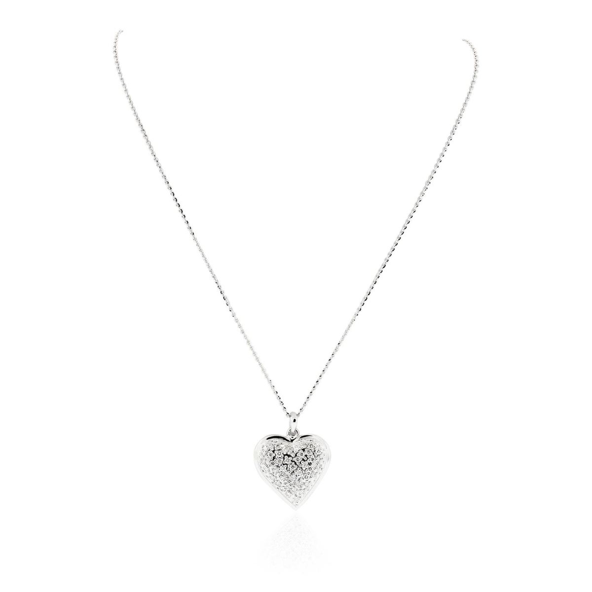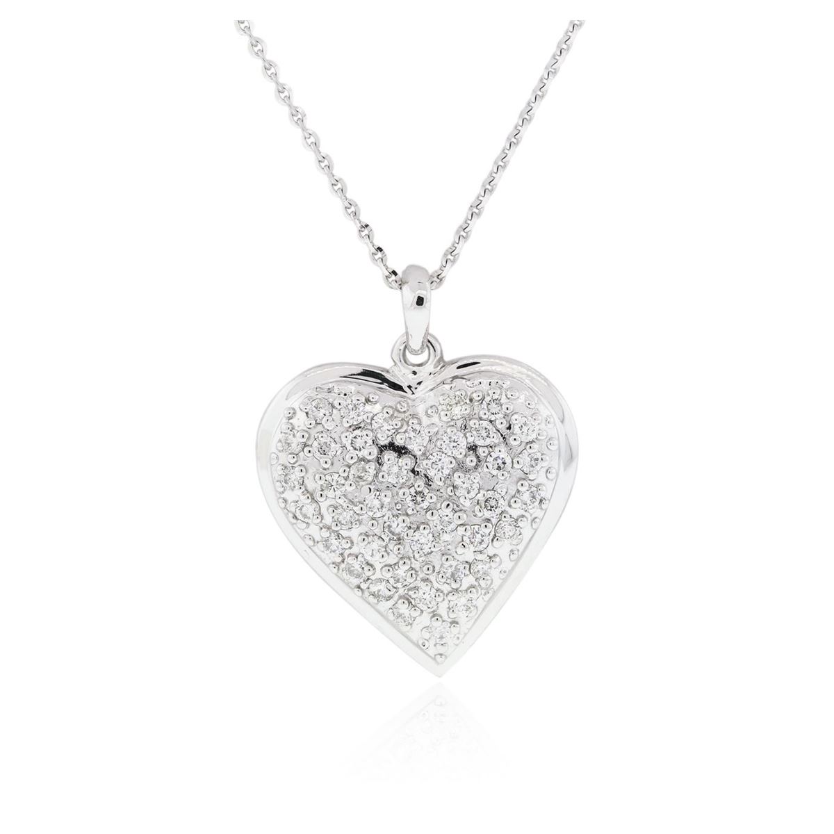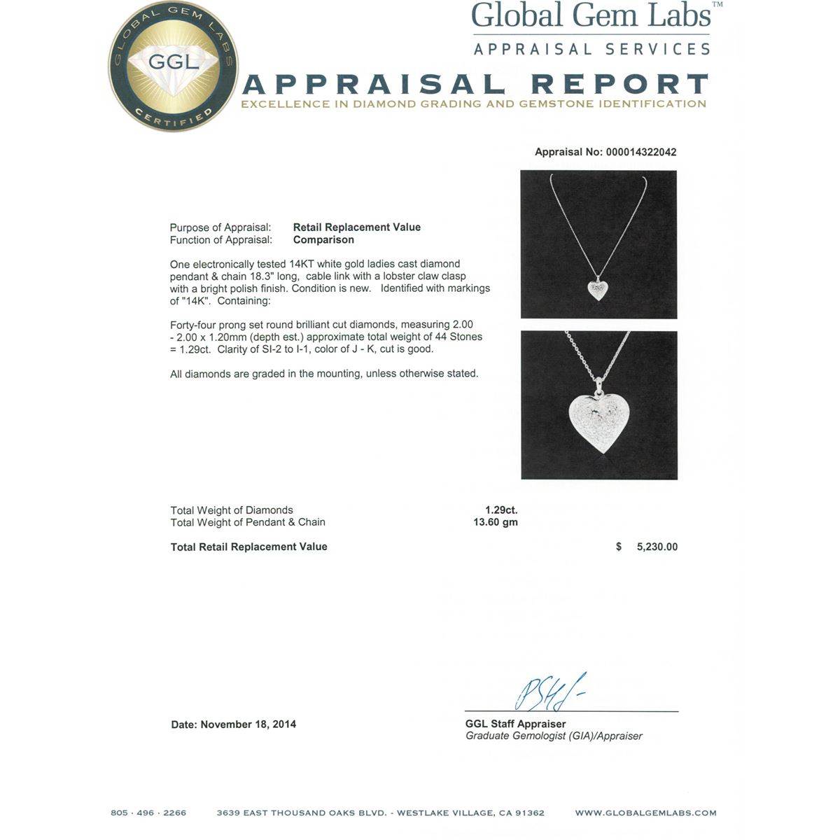 One electronically tested 14KT white gold ladies cast diamond pendant & chain 18.3" long, cable link with a lobster claw clasp with a bright polish finish. Identified with markings of "14K". Condition is new. Containing: Forty-Four prong set round brilliant cut diamonds, measuring 2.00 - 2.00 x 1.20mm (depth est.) approximate total weight of 44 Stones = 1.29ct. Clarity: SI-2 to I-1. Color: J - K, Cut is Good. All diamonds are graded in the mounting, unless otherwise stated. Total Weight of Diamonds 1.29ct. Total Weight of Pendant & Chain 13.60 grams. GGL Appraised at $5,230.00.