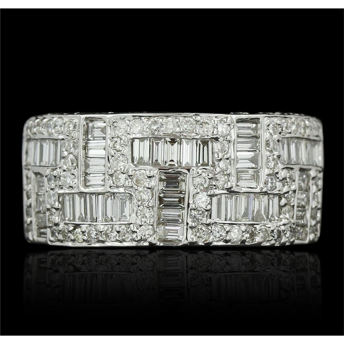 One electronically tested 14KT white gold Ladies combination cast & assembled fancy ring with a bright polish finish. Condition is new. Identified with markings of "14K". Containing: Eighty-One prong set round brilliant cut diamonds, measuring 1.10 - 1.10 x 0.66mm (depth est.) approximate. Total Weight of 81 Stones = 0.39ct. Clarity: SI-2 to I-1. Color: G - H, Cut is Good. Forty-Five channel set baguette cut diamonds, measuring 1.70 x 1.30 x 1.11mm (depth est.) approximate. Total Weight of 45 Stones = 0.90ct. Clarity: VS-2 to SI-1. Color: G - H, Cut is Good. Total Weight of Diamonds 1.29ct. Total Weight of Ring 8.60gm. GGL Appraised at $7,550.00.