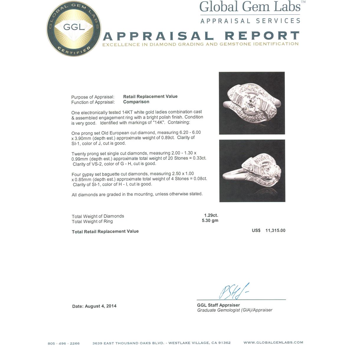 One electronically tested 14KT white gold ladies combination cast & assembled engagement ring with a bright polish finish. Condition is very good. Identified with markings of "14K". Containing: One prong set Old European cut diamond, measuring 6.20 - 6.00 x 3.90mm (depth est.) approximate weight of 0.89ct. Clarity: SI-1. Color: J, Cut is Good. Twenty prong set single cut diamonds, measuring 2.00 - 1.30 x 0.99mm (depth est.) approximate. Total Weight of 20 Stones = 0.33ct. Clarity: VS-2. Color: G - H, Cut is Good. Four gypsy set baguette cut diamonds, measuring 2.50 x 1.00 x 0.85mm (depth est.) approximate. Total Weight of 4 Stones = 0.08ct. Clarity: SI-1. Color: H - I, Cut is Good. All diamonds are graded in the mounting, unless otherwise stated. Total Weight of Diamonds 1.29ct. Total Weight of Ring 5.30 grams. GGL Appraised at $11,315.00.