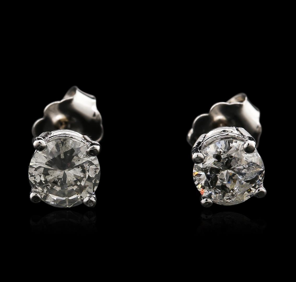 One pair electronically tested 14KT white gold ladies cast diamond stud earrings with friction posts with a bright polish finish. Identified with markings of "14K". Condition is new. Containing: Two prong set round brilliant cut diamonds, measuring 5.60 - 5.60 x 3.38mm (depth est.) approximate total weight of 2 Stones = 1.29ct. Clarity: I-2 to I-3. Color: J, Cut is Good. Diamonds are graded in the mounting, unless otherwise stated. Total Weight of Diamonds 1.29ct. Total Weight of Stud Earrings 1.20 grams. GGL Appraised at $2,475.00.