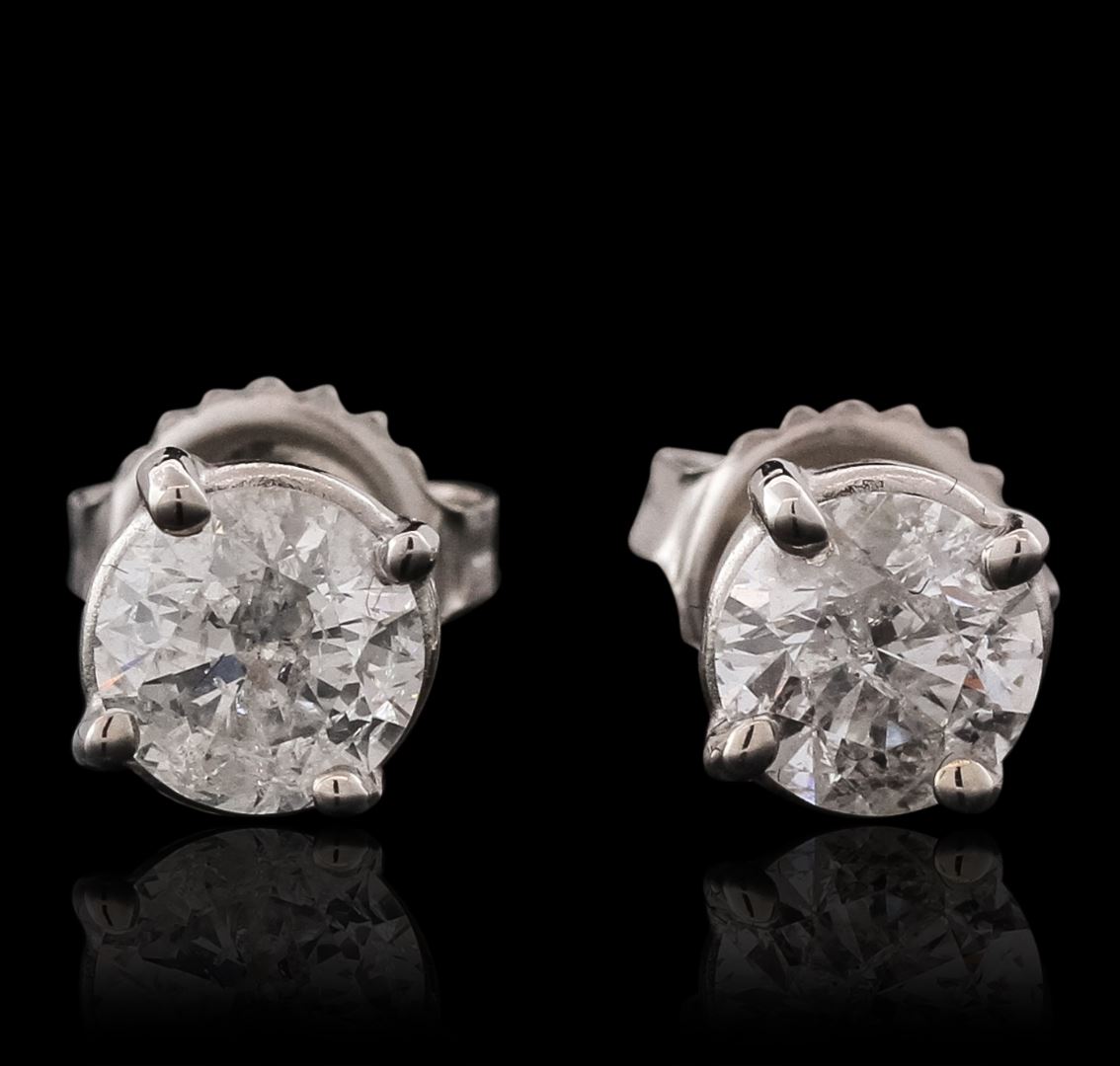 One pair electronically tested 14KT white gold ladies cast stud earrings with friction posts with a bright polish finish. Identified with markings of "14K". Condition is new. Containing: One prong set round brilliant cut diamond, measuring 5.59 - 5.64 x 3.37mm (depth est.) approximate weight of 0.65ct. Clarity: I-3. Color: I, Cut is Good. One prong set round brilliant cut diamond, measuring 5.58 - 5.61 x 3.36mm (depth est.) approximate weight of 0.64ct. Clarity: I-3. Color: I, Cut is Good. All diamonds are graded in the mounting, unless otherwise stated total weight of Diamonds 1.29ct. Total Weight of Earrings 1.70 grams. GGL Appraised at $4,640.00.