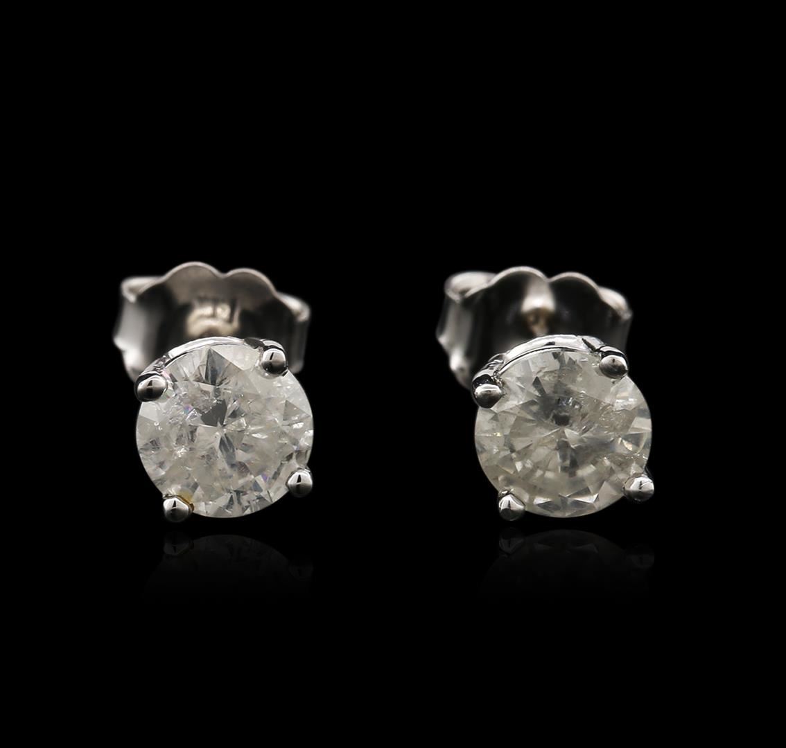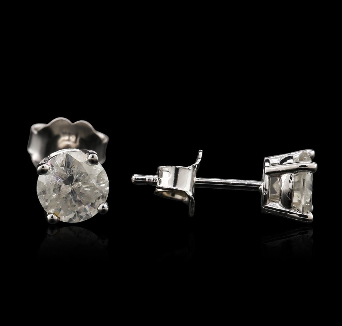 One pair electronically tested 14KT white gold ladies cast diamond stud earrings with friction posts with a bright polish finish. Identified with markings of "14K". Condition is new. Containing: Two prong set round brilliant cut diamonds, measuring 5.60 - 5.60 x 3.38mm (depth est.) approximate total weight of 2 Stones = 1.29ct. Clarity: I-3 to I-3. Color: I, Cut is Good. Diamonds are graded in the mounting, unless otherwise stated. Total Weight of Diamonds 1.29ct. Total Weight of Stud Earrings 1.00 grams. GGL Appraised at $1,885.00.