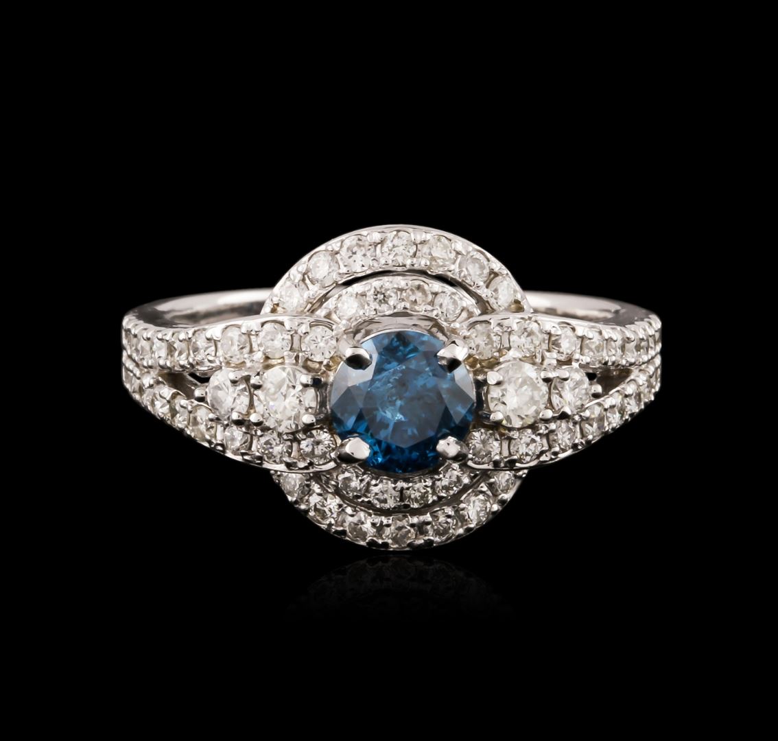 One electronically tested 14KT white gold ladies cast diamond engagement ring with a bright polish finish. Identified with markings of "14K". Condition is new. Containing: One prong set round brilliant cut diamond, measuring 5.33 - 5.32 x 3.20mm (depth est.) approximate weight of 0.55ct. Clarity: I-2, Cut is Good. The color of the stone has been treated. Four prong set round brilliant cut diamonds, measuring 2.40 - 2.00 x 1.32mm (depth est.) approximate total weight of 4 Stones = 0.16ct. Clarity: SI-1 to SI-2. Color: I - J, Cut is Good. Fifty-Eight prong set round brilliant cut diamonds, measuring 1.50 - 1.30 x 0.84mm (depth est.) approximate total weight of 58 Stones = 0.58ct. Clarity: SI-1 to I-1. Color: I - J, Cut is Good. All diamonds are graded in the mounting, unless otherwise stated. Total Weight of Diamonds 1.29ct. Total Weight of Engagement Ring 4.90 grams. GGL Appraised at $4,325.00.