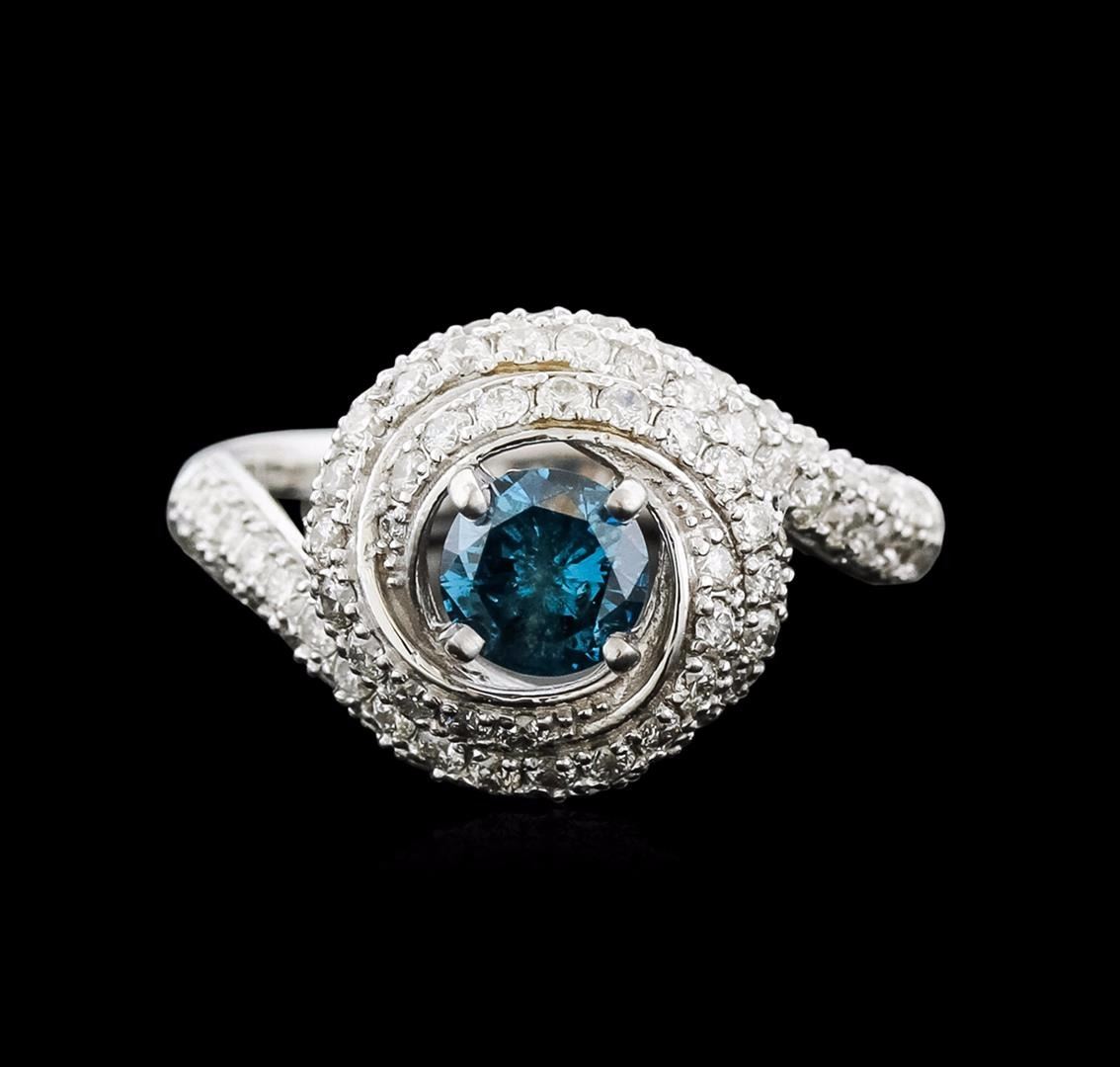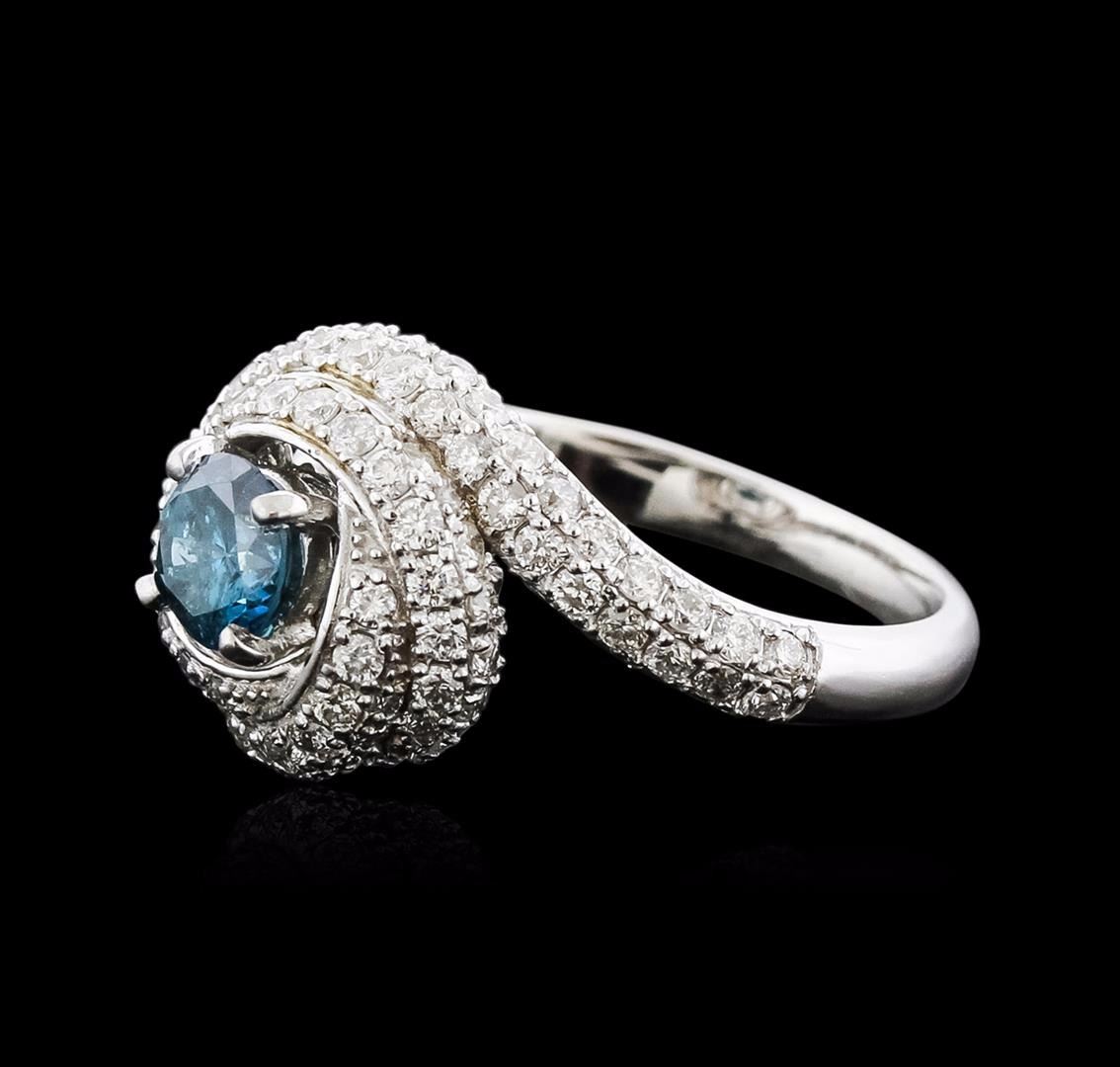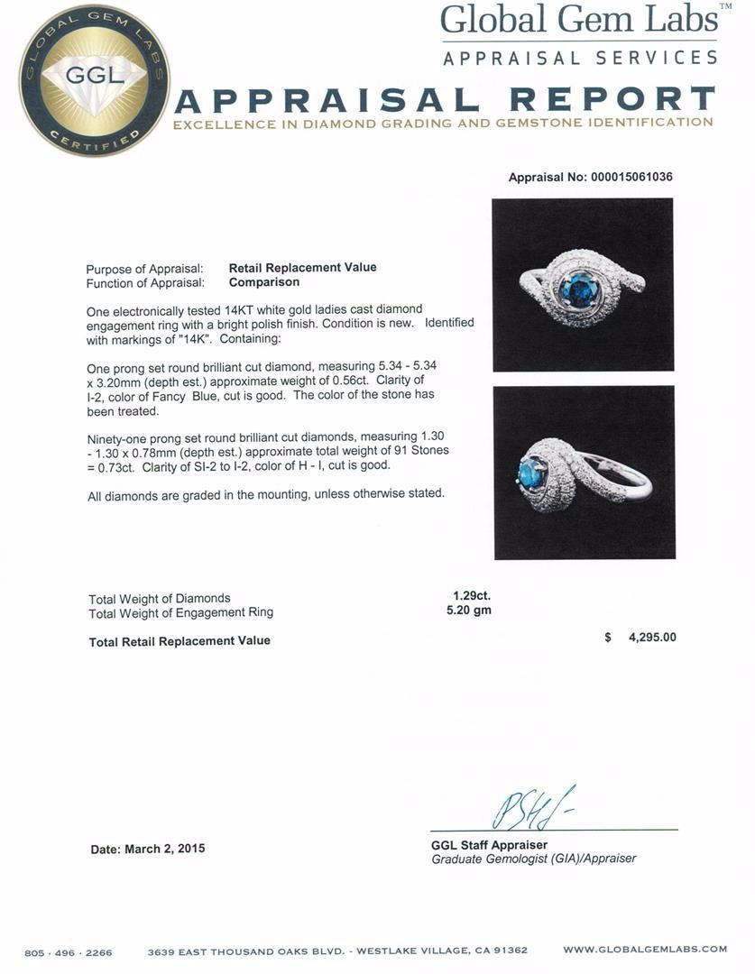 One electronically tested 14KT white gold ladies cast diamond engagement ring with a bright polish finish. Identified with markings of "14K". Condition is new. Containing: One prong set round brilliant cut diamond, measuring 5.34 - 5.34 x 3.20mm (depth est.) approximate weight of 0.56ct. Clarity: I-2, Cut is Good. The color of the stone has been treated. Ninety-One prong set round brilliant cut diamonds, measuring 1.30 - 1.30 x 0.78mm (depth est.) approximate total weight of 91 Stones = 0.73ct. Clarity: SI-2 to I-2. Color: H - I, Cut is Good. All diamonds are graded in the mounting, unless otherwise stated. Total Weight of Diamonds 1.29ct. Total Weight of Engagement Ring 5.20 grams. GGL Appraised at $4,295.00.