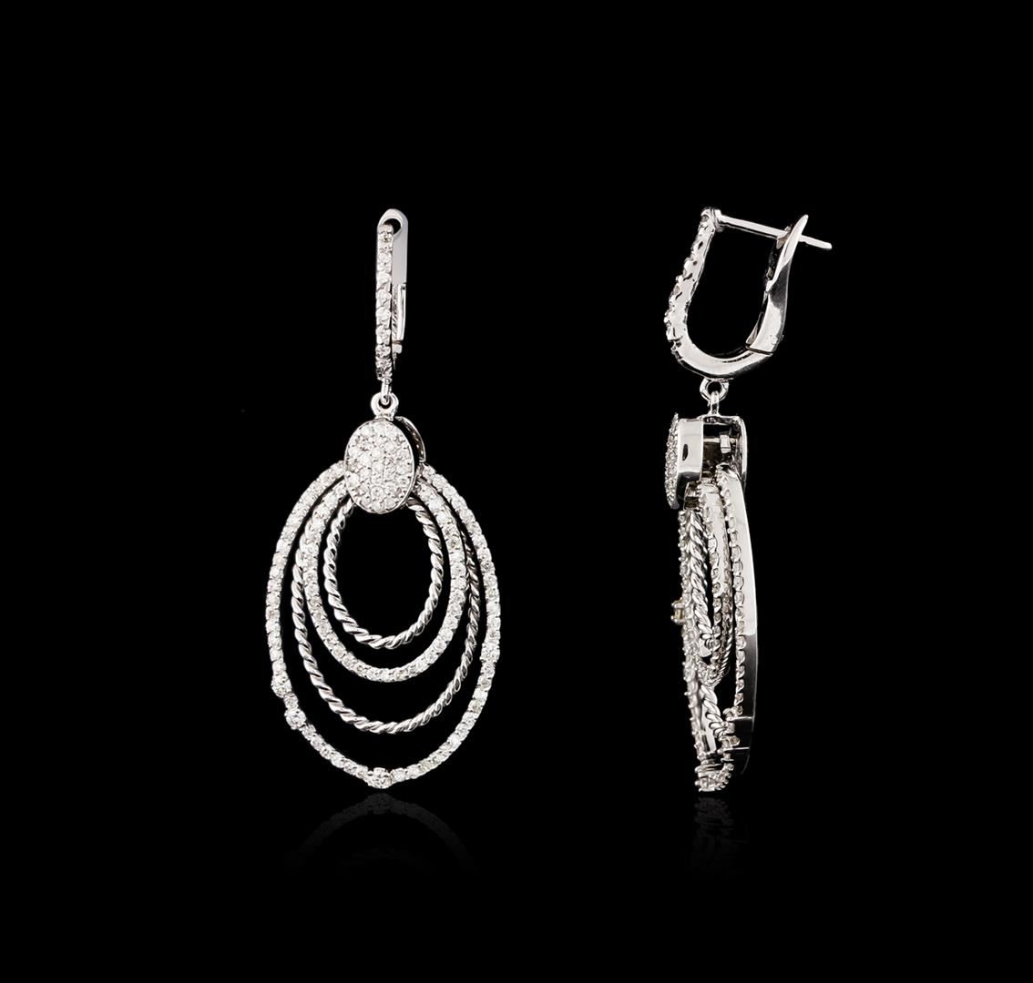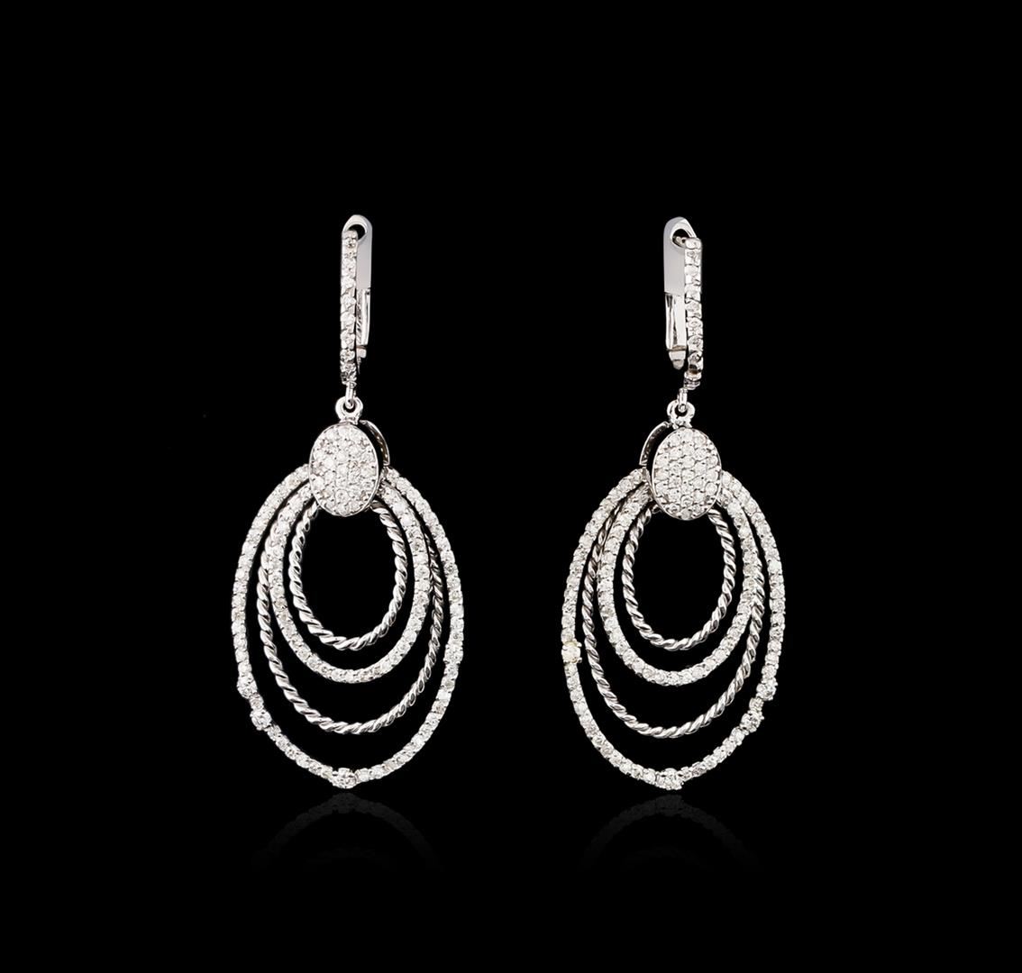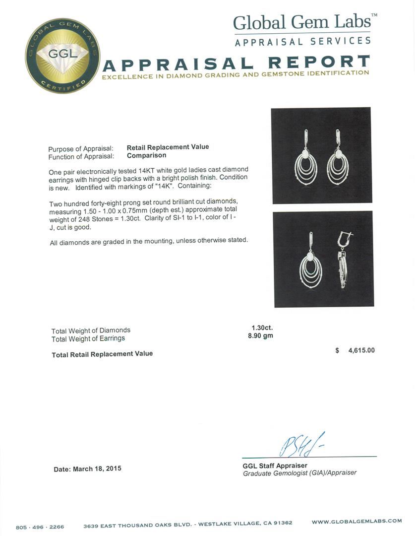 One pair electronically tested 14KT white gold ladies cast diamond earrings with hinged clip backs with a bright polish finish. Identified with markings of "14K". Condition is new. Containing: Two Hundred Forty-Eight prong set round brilliant cut diamonds, measuring 1.50 - 1.00 x 0.75mm (depth est.) approximate total weight of 248 Stones = 1.30ct. Clarity of SI-1 to I-1, Color of I - J, Cut is Good. All diamonds are graded in the mounting, unless otherwise stated. Total Weight of Diamonds 1.30ct. Total Weight of Earrings 8.90 grams. GGL Appraised at $4,615.00.