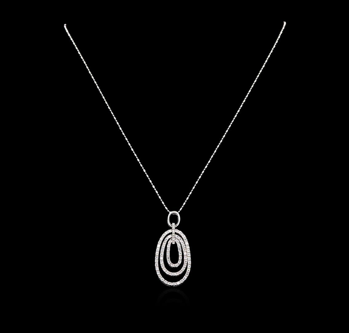 One electronically tested 14KT white gold ladies cast diamond pendant & chain 18.0" long, with a spring ring clasp with a bright polish finish. Identified with markings of "14K". Condition is new. Containing: Seventy-Eight prong set round brilliant cut diamonds, measuring 1.50 - 1.30 x 0.84mm (depth est.) approximate total weight of 78 Stones = 1.30ct. Clarity: SI-1 to SI-2. Color: G - H, Cut is Good. All diamonds are graded in the mounting, unless otherwise stated. Total Weight of Diamonds 1.30ct. Total Weight of Pendant & Chain 8.90 grams. GGL Appraised at $4,210.00.