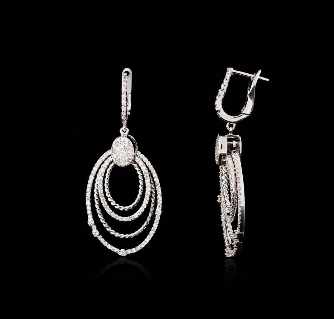 One pair electronically tested 14KT white gold ladies cast diamond earrings with hinged clip backs with a bright polish finish. Identified with markings of "14K". Condition is new. Containing: Two Hundred Forty-Eight prong set round brilliant cut diamonds, measuring 1.50 - 1.00 x 0.75mm (depth est.) approximate total weight of 248 Stones = 1.30ct. Clarity of SI-1 to I-1, Color of I - J, Cut is Good. All diamonds are graded in the mounting, unless otherwise stated. Total Weight of Diamonds 1.30ct. Total Weight of Earrings 8.90 grams. GGL Appraised at $4,615.00.