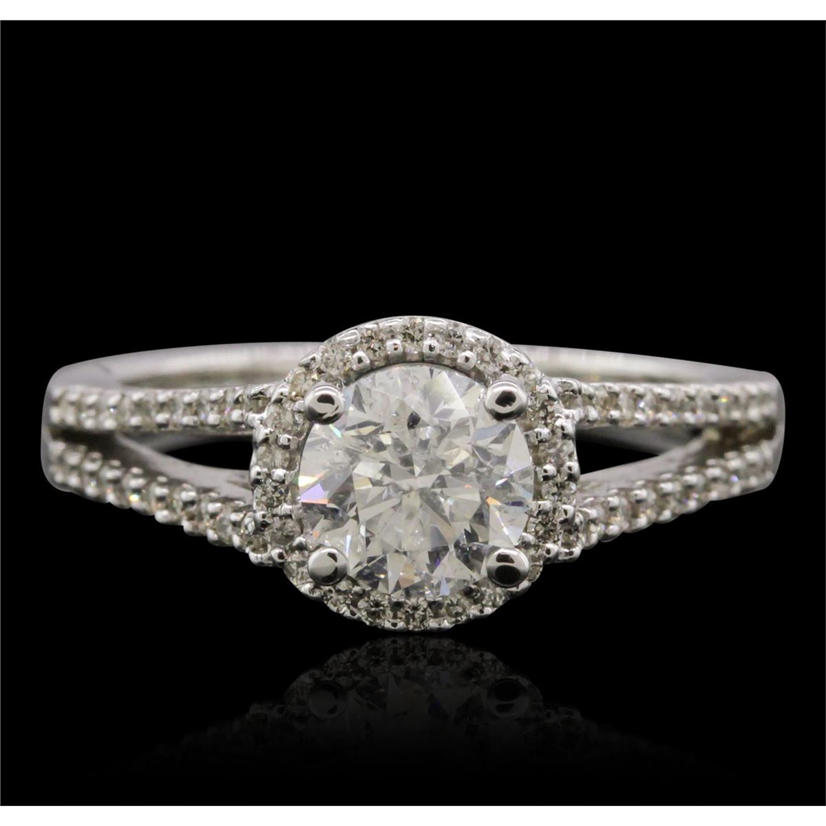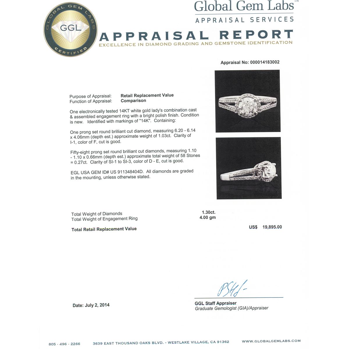 One electronically tested 14KT white gold Ladies combination cast & assembled engagement ring with a bright polish finish. Condition is new. Identified with markings of "14K". Containing: One prong set round brilliant cut diamond, measuring 6.20 - 6.14 x 4.06mm (depth est.) approximate weight of 1.03ct. Clarity: I-1. Color: F, Cut is Good. Fifty-Eight prong set round brilliant cut diamonds, measuring 1.10 - 1.10 x 0.66mm (depth est.) approximate. Total Weight of 58 Stones = 0.27ct. Clarity: SI-1 to SI-3. Color: D - E, Cut is Good. EGL USA GEM ID# US 911348404D. All diamonds are graded in the mounting, unless otherwise stated. Total Weight of Diamonds 1.30ct. Total Weight of Engagement Ring 4.00 grams. GGL Appraised at $19,895.00.