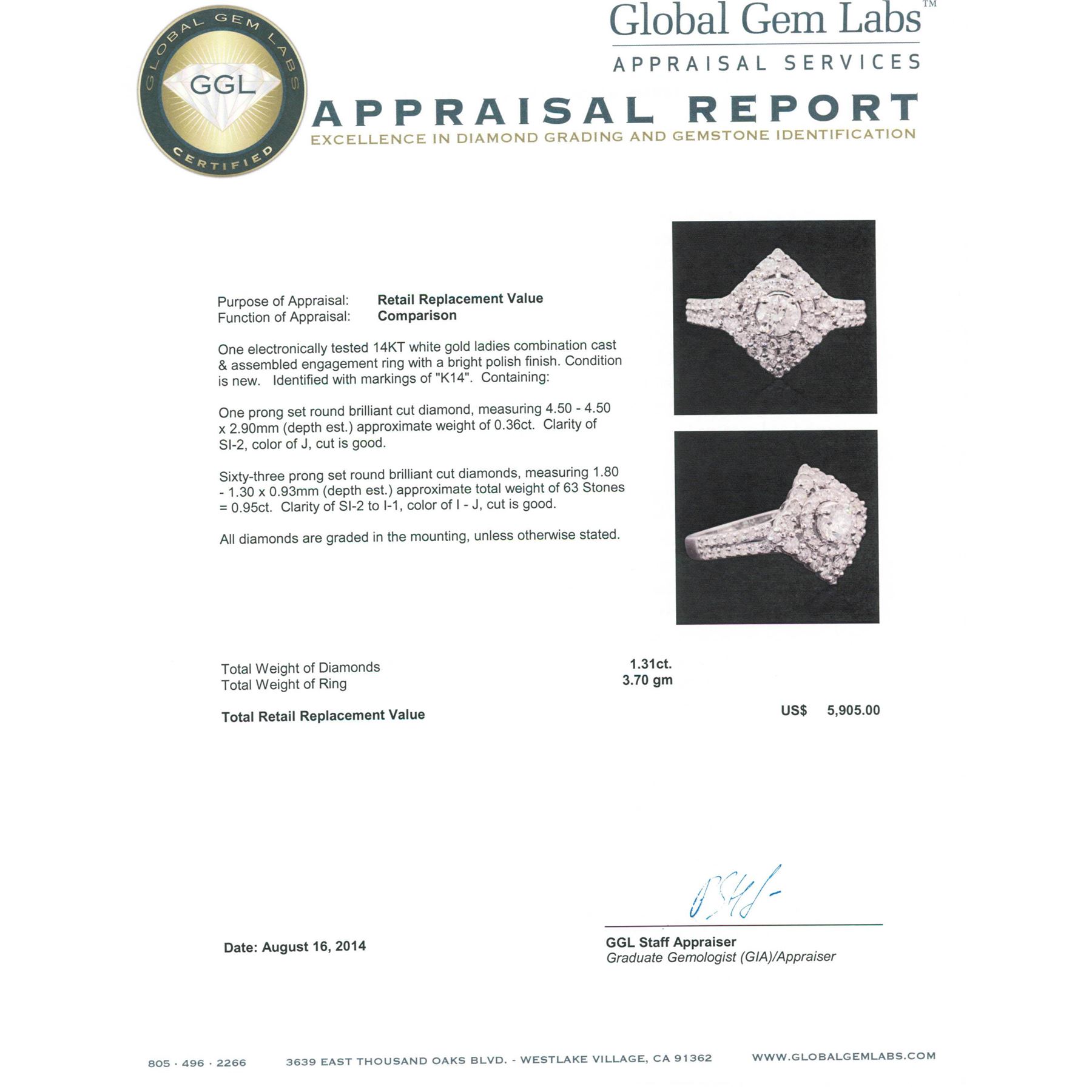 One electronically tested 14KT white gold ladies combination cast & assembled engagement ring with a bright polish finish. Condition is new. Identified with markings of "K14". Containing: One prong set round brilliant cut diamond, measuring 4.50 - 4.50 x 2.90mm (depth est.) approximate weight of 0.36ct. Clarity: SI-2. Color: J, Cut is Good. Sixty-Three prong set round brilliant cut diamonds, measuring 1.80 - 1.30 x 0.93mm (depth est.) approximate. Total Weight of 63 Stones = 0.95ct. Clarity: SI-2 to I-1. Color: I - J, Cut is Good. All diamonds are graded in the mounting, unless otherwise stated. Total Weight of Diamonds 1.31ct. Total Weight of Ring 3.70 grams. GGL Appraised at $5,905.00.