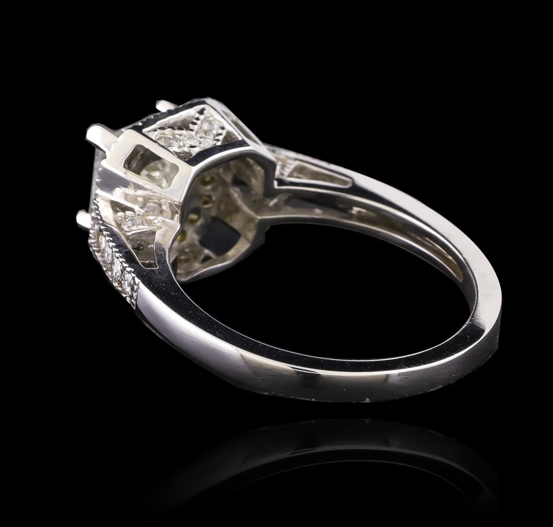 One electronically tested 14KT white gold ladies cast diamond ring with a bright polish finish. Identified with markings of "14K". Condition is new. Containing: One prong set princess cut diamond, measuring 5.40 x 5.40 x 4.05mm (depth est.) approximate weight of 0.93ct. Clarity: I-2. Color: J, Cut is Good. Twenty-Two gypsy set round brilliant cut diamonds, measuring 1.50 - 1.20 x 0.81mm (depth est.) approximate total weight of 22 Stones = 0.20 ct. Clarity: I-1 to I-2. Color: H - I. Twenty-One prong set single cut diamonds, measuring 1.30 - 1.30 x 0.78mm (depth est.) approximate total weight of 21 Stones = 0.18ct. Clarity: SI-1 to SI-2, Cut is Good. Color of the stones has been treated. Diamonds are graded in the mounting, unless otherwise stated. Total Weight of Diamonds 1.31ct. Total Weight of Ring 4.10 grams. GGL Appraised.