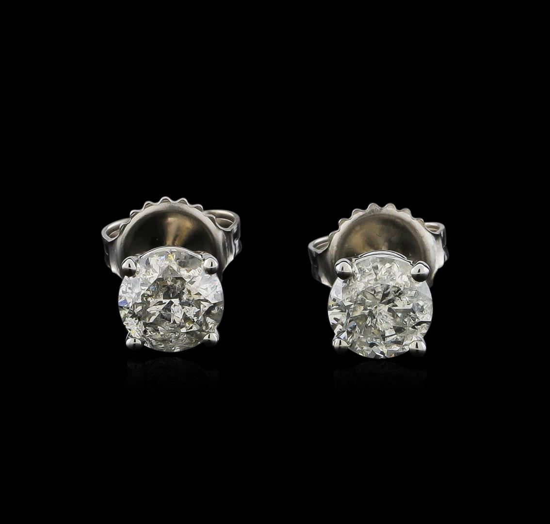 One pair electronically tested 14KT white gold ladies cast stud earrings with friction posts with a bright polish finish. Identified with markings of "14K". Condition is new. Containing: One prong set round brilliant cut diamond, measuring 5.65 - 5.62 x 3.38mm (depth est.) approximate weight of 0.66ct. Clarity: I-3. Color: I, Cut is Good. One prong set round brilliant cut diamond, measuring 5.64 - 5.60 x 3.38mm (depth est.) approximate weight of 0.65ct. Clarity: I-3. Color: I, Cut is Good. All diamonds are graded in the mounting, unless otherwise stated total weight of Diamonds 1.31ct. Total Weight of Earrings 1.60 grams. GGL Appraised at $4,655.00.
