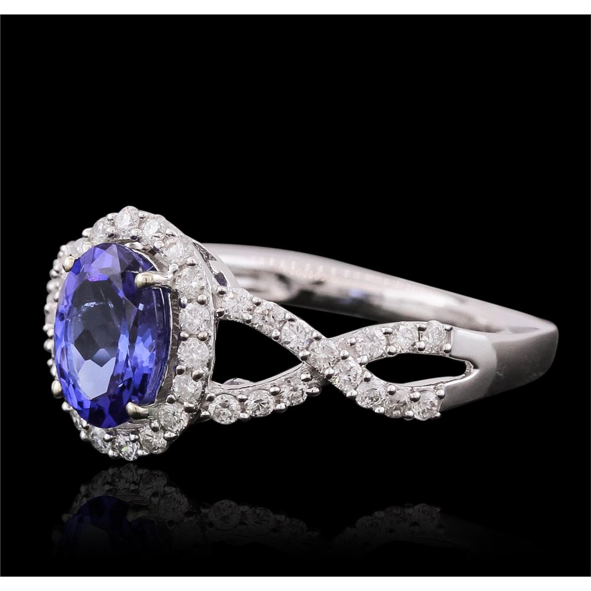 One electronically tested 14KT white gold ladies cast tanzanite and diamond ring with a bright polish finish. The featured tanzanite is set within a diamond bezel supported by intertwining diamond set shoulders, completed by a two millimeter wide band. Trademark is Orianne. Identified with markings of "14K". Condition is new, good workmanship. Containing: One prong set oval mixed cut natural tanzanite, measuring 8.10 x 6.10 x 3.65mm, 6% bulge factor, approximate weight of 1.31ct., clarity is eye clean, type I, medium dark, very slightly grayish, violetish blue color, (GIA vB 6/3), cut is good. Transmitting light with no distortion, transparent. Graded in the setting. Tanzanite is a very rare gemstone that is only found in the country of Tanzania. Originally discovered in 1967. Tiffany & Company, named the stone Tanzanite. It is found in the Usumburu Mountains that border the Umba Valley of northern Tanzania. Tanzanite occurs in gray, brown, violet, blue, reddish-purple, & green. The gem is interesting because of its exceptional pleochroism. Rotated in different directions a tanzanite will exhibit multiple changes of color. Tanzanite has a low tolerance to ultrasonic cleaning, and should not be cleaned using this method. Forty-Six prong set round brilliant cut diamonds, measuring 1.30 - 1.20 x 0.75mm (depth est.) approximate total weight of 46 Stones = 0.42ct. Graded in the setting. Clarity: I-1 to I-2. Color: G - I. Total Weight of Colored Stones 1.31ct. Total Weight of Diamonds 0.42ct. Total Weight of Ring 3.42 grams. AIG Appraised at $4,310.00.