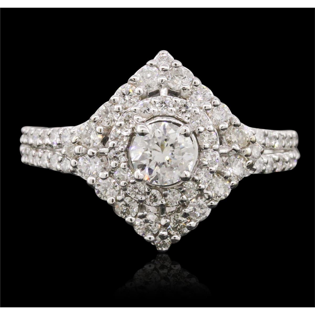 One electronically tested 14KT white gold ladies combination cast & assembled engagement ring with a bright polish finish. Condition is new. Identified with markings of "K14". Containing: One prong set round brilliant cut diamond, measuring 4.50 - 4.50 x 2.90mm (depth est.) approximate weight of 0.36ct. Clarity: SI-2. Color: J, Cut is Good. Sixty-Three prong set round brilliant cut diamonds, measuring 1.80 - 1.30 x 0.93mm (depth est.) approximate. Total Weight of 63 Stones = 0.95ct. Clarity: SI-2 to I-1. Color: I - J, Cut is Good. All diamonds are graded in the mounting, unless otherwise stated. Total Weight of Diamonds 1.31ct. Total Weight of Ring 3.70 grams. GGL Appraised at $5,905.00.