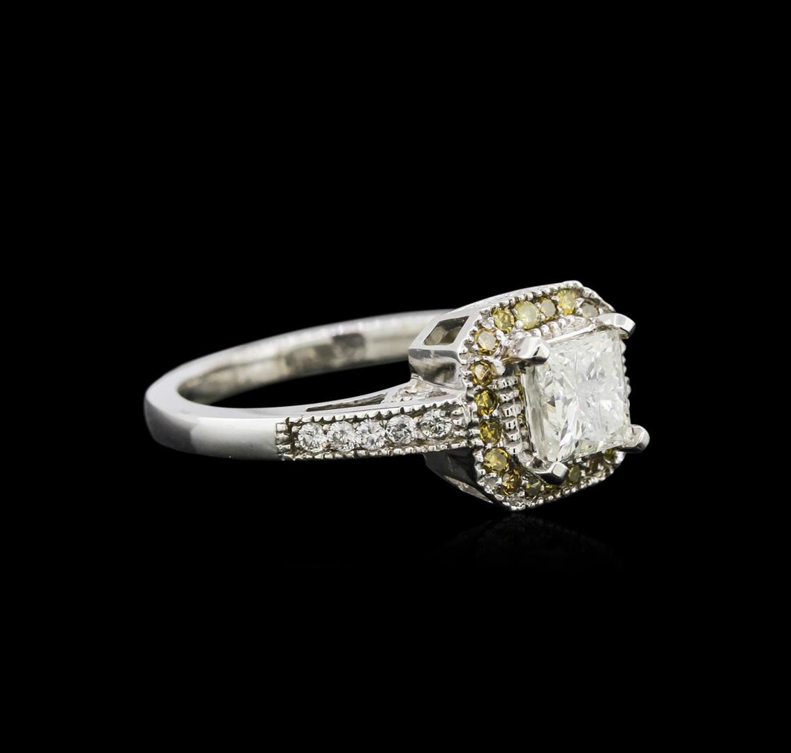 One electronically tested 14KT white gold ladies cast diamond ring with a bright polish finish. Identified with markings of "14K". Condition is new. Containing: One prong set princess cut diamond, measuring 5.40 x 5.40 x 4.05mm (depth est.) approximate weight of 0.93ct. Clarity: I-2. Color: J, Cut is Good. Twenty-Two gypsy set round brilliant cut diamonds, measuring 1.50 - 1.20 x 0.81mm (depth est.) approximate total weight of 22 Stones = 0.20ct. Clarity: I-1 to I-2. Color: H - I. Twenty-One prong set single cut diamonds, measuring 1.30 - 1.30 x 0.78mm (depth est.) approximate total weight of 21 Stones = 0.18ct. Clarity: SI-1 to SI-2, Cut is Good. Color of the stones has been treated. Diamonds are graded in the mounting, unless otherwise stated. Total Weight of Diamonds 1.31ct. Total Weight of Ring 4.10 grams. GGL Appraised at $3,885.00.