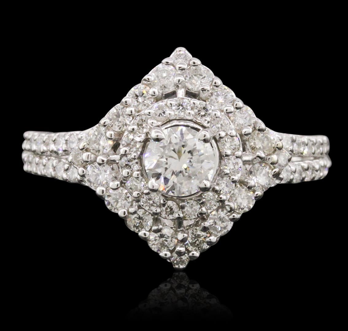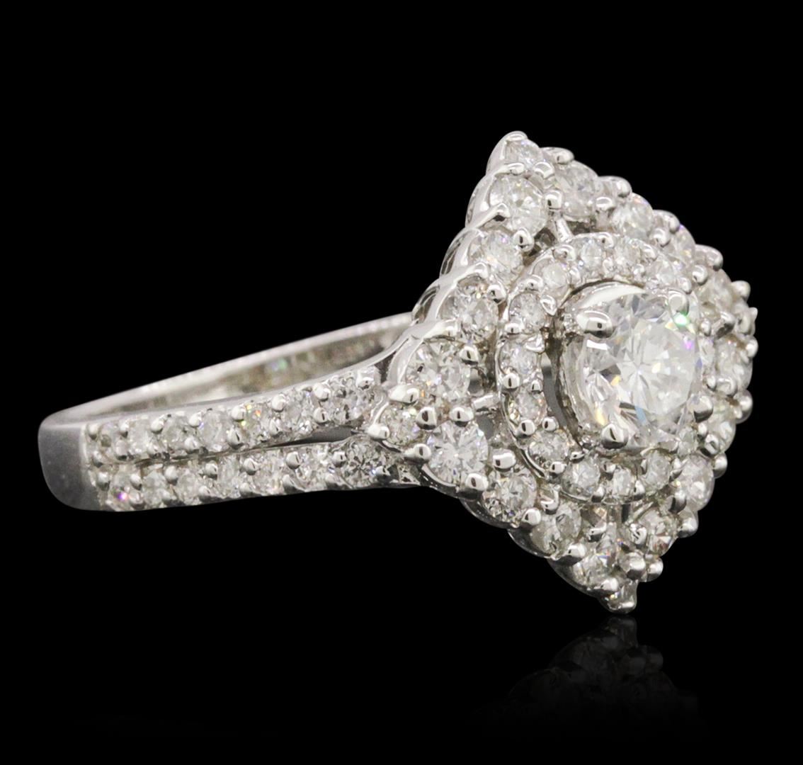 One electronically tested 14KT white gold ladies combination cast & assembled engagement ring with a bright polish finish. Condition is new. Identified with markings of "K14". Containing: One prong set round brilliant cut diamond, measuring 4.50 - 4.50 x 2.90mm (depth est.) approximate weight of 0.36ct. Clarity: SI-2. Color: J, Cut is Good. Sixty-Three prong set round brilliant cut diamonds, measuring 1.80 - 1.30 x 0.93mm (depth est.) approximate. Total Weight of 63 Stones = 0.95ct. Clarity: SI-2 to I-1. Color: I - J, Cut is Good. All diamonds are graded in the mounting, unless otherwise stated. Total Weight of Diamonds 1.31ct. Total Weight of Ring 3.70 grams. GGL Appraised at $5,905.00.