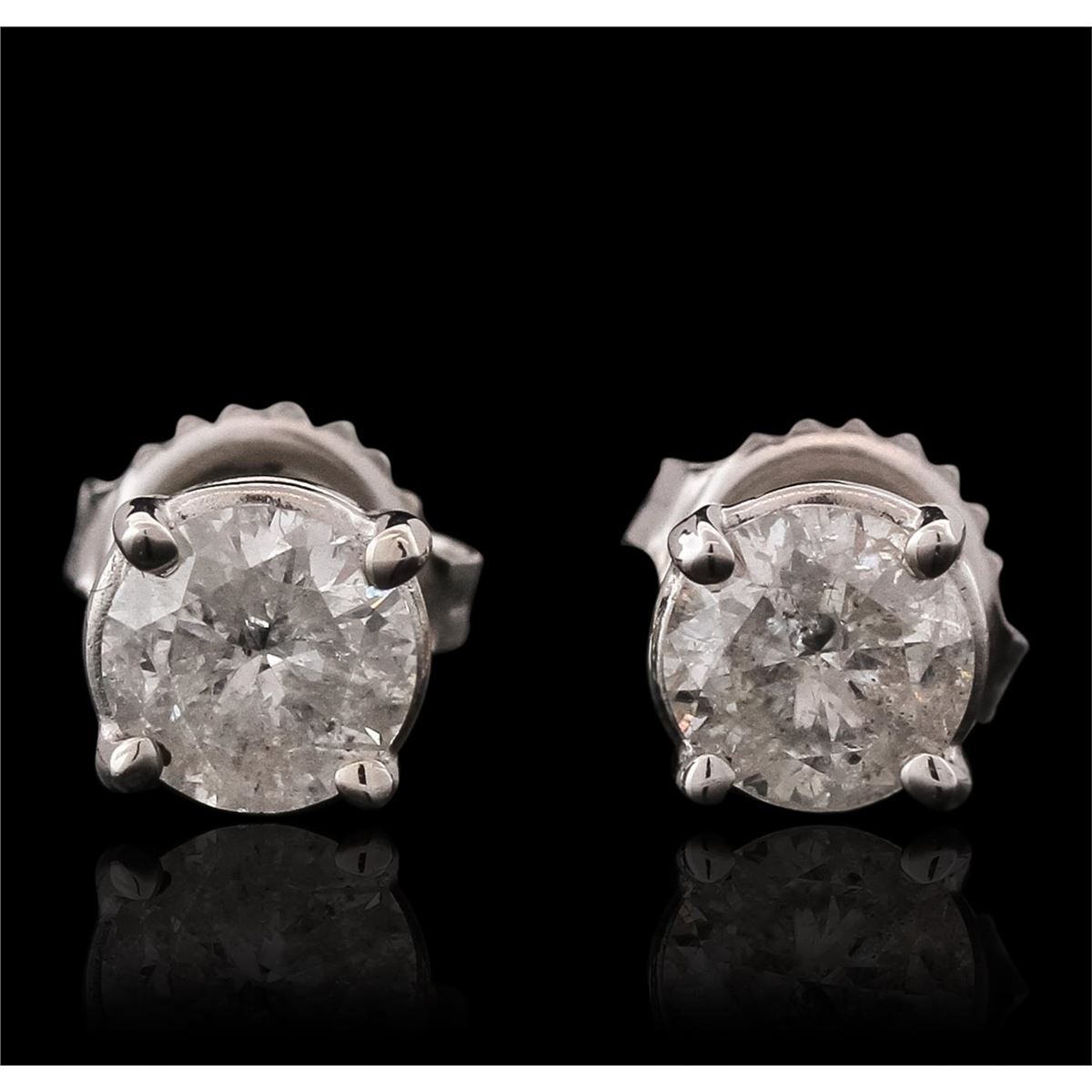 One pair electronically tested 14KT white gold ladies cast stud earrings with friction posts with a bright polish finish. Identified with markings of "14K". Condition is new. Containing: One prong set round brilliant cut diamond, measuring 5.61 - 5.63 x 3.37mm (depth est.) approximate weight of 0.65ct. Clarity: I-3. Color: I, Cut is Good. One prong set round brilliant cut diamond, measuring 5.55 - 5.76 x 3.40mm (depth est.) approximate weight of 0.66ct. Clarity: I-3. Color: I, Cut is Good. All diamonds are graded in the mounting, unless otherwise stated total weight of Diamonds 1.31ct. Total Weight of Earrings 1.70 grams. GGL Appraised at $4,710.00.