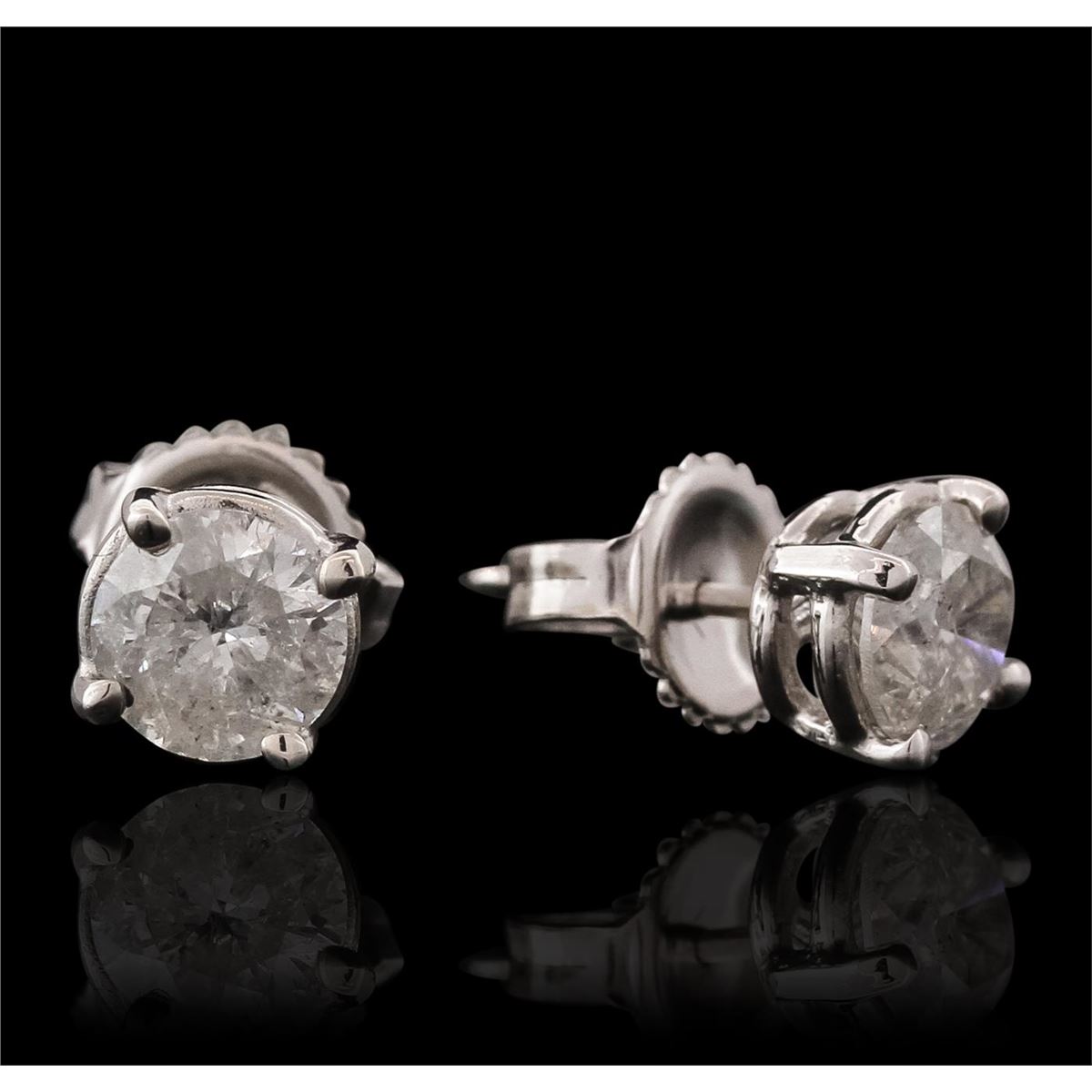 One pair electronically tested 14KT white gold ladies cast stud earrings with friction posts with a bright polish finish. Identified with markings of "14K". Condition is new. Containing: One prong set round brilliant cut diamond, measuring 5.61 - 5.63 x 3.37mm (depth est.) approximate weight of 0.65ct. Clarity: I-3. Color: I, Cut is Good. One prong set round brilliant cut diamond, measuring 5.55 - 5.76 x 3.40mm (depth est.) approximate weight of 0.66ct. Clarity: I-3. Color: I, Cut is Good. All diamonds are graded in the mounting, unless otherwise stated total weight of Diamonds 1.31ct. Total Weight of Earrings 1.70 grams. GGL Appraised at $4,710.00.