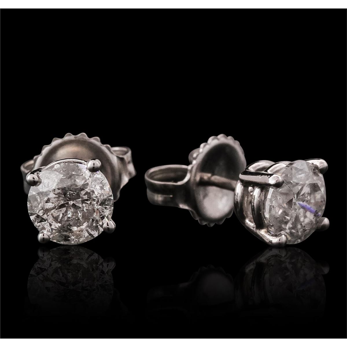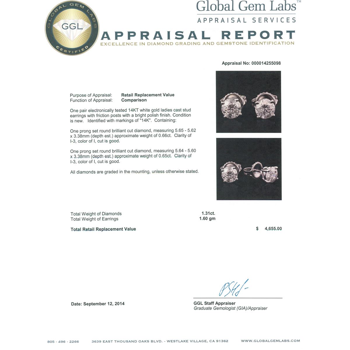 One pair electronically tested 14KT white gold ladies cast stud earrings with friction posts with a bright polish finish. Identified with markings of "14K". Condition is new. Containing: One prong set round brilliant cut diamond, measuring 5.65 - 5.62 x 3.38mm (depth est.) approximate weight of 0.66ct. Clarity: I-3. Color: I, Cut is Good. One prong set round brilliant cut diamond, measuring 5.64 - 5.60 x 3.38mm (depth est.) approximate weight of 0.65ct. Clarity: I-3. Color: I, Cut is Good. All diamonds are graded in the mounting, unless otherwise stated total weight of Diamonds 1.31ct. Total Weight of Earrings 1.60 grams. GGL Appraised at $4,655.00.