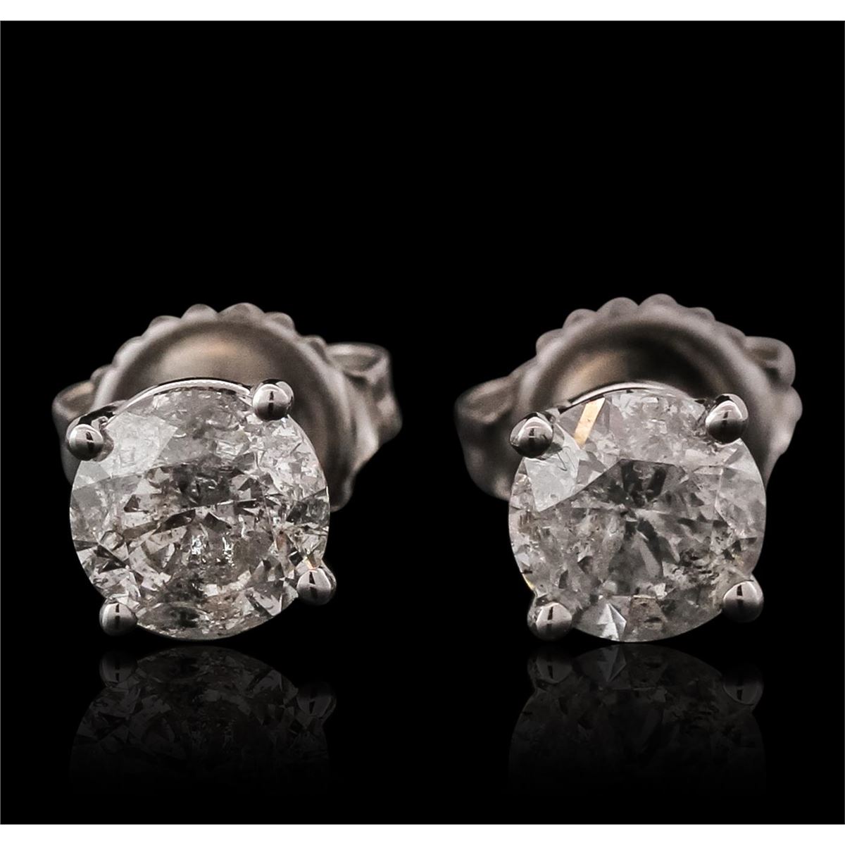 One pair electronically tested 14KT white gold ladies cast stud earrings with friction posts with a bright polish finish. Identified with markings of "14K". Condition is new. Containing: One prong set round brilliant cut diamond, measuring 5.65 - 5.62 x 3.38mm (depth est.) approximate weight of 0.66ct. Clarity: I-3. Color: I, Cut is Good. One prong set round brilliant cut diamond, measuring 5.64 - 5.60 x 3.38mm (depth est.) approximate weight of 0.65ct. Clarity: I-3. Color: I, Cut is Good. All diamonds are graded in the mounting, unless otherwise stated total weight of Diamonds 1.31ct. Total Weight of Earrings 1.60 grams. GGL Appraised at $4,655.00.
