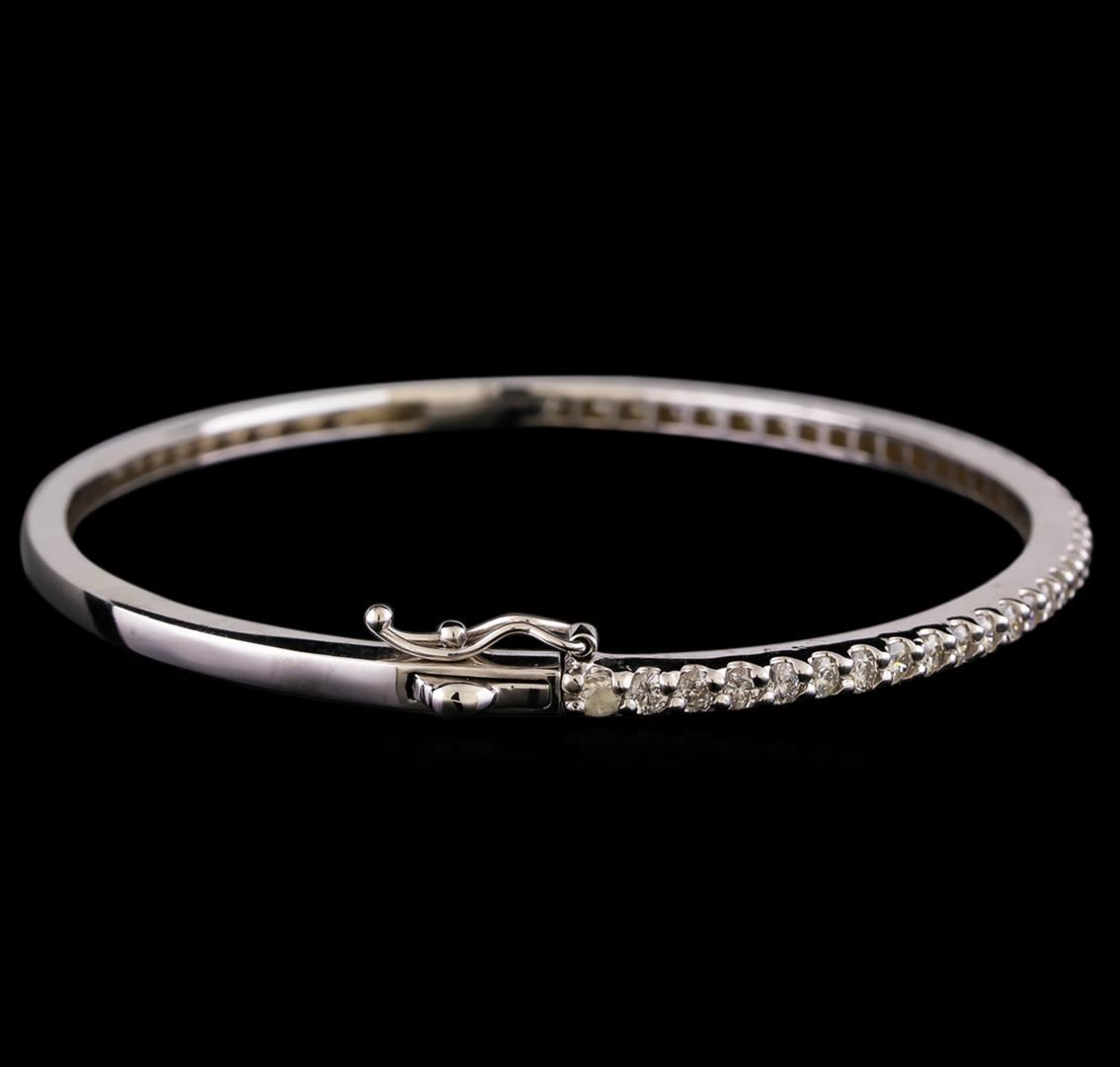 One electronically tested 14KT white gold ladies cast diamond bangle bracelet with a hidden box clasp with a bright polish finish. Identified with markings of "14K". Condition is new. Containing: Thirty-Nine prong set round brilliant cut diamonds, measuring 2.10 - 2.10 x 1.26mm (depth est.) approximate total weight of 39 Stones = 1.32ct. Clarity: SI-2 to I-1. Color: I - J, Cut is Good. All diamonds are graded in the mounting, unless otherwise stated. Total Weight of Diamonds 1.32ct. Total Weight of Bangle Bracelet 11.50 grams. GGL Appraised at $4,945.00.
