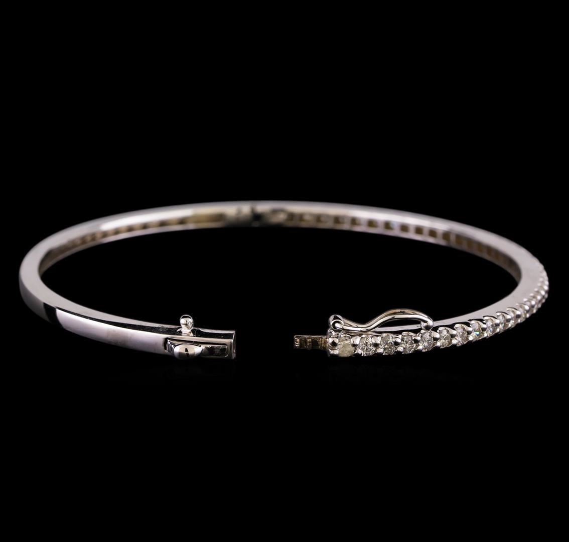 One electronically tested 14KT white gold ladies cast diamond bangle bracelet with a hidden box clasp with a bright polish finish. Identified with markings of "14K". Condition is new. Containing: Thirty-Nine prong set round brilliant cut diamonds, measuring 2.10 - 2.10 x 1.26mm (depth est.) approximate total weight of 39 Stones = 1.32ct. Clarity: SI-2 to I-1. Color: I - J, Cut is Good. All diamonds are graded in the mounting, unless otherwise stated. Total Weight of Diamonds 1.32ct. Total Weight of Bangle Bracelet 11.50 grams. GGL Appraised at $4,945.00.