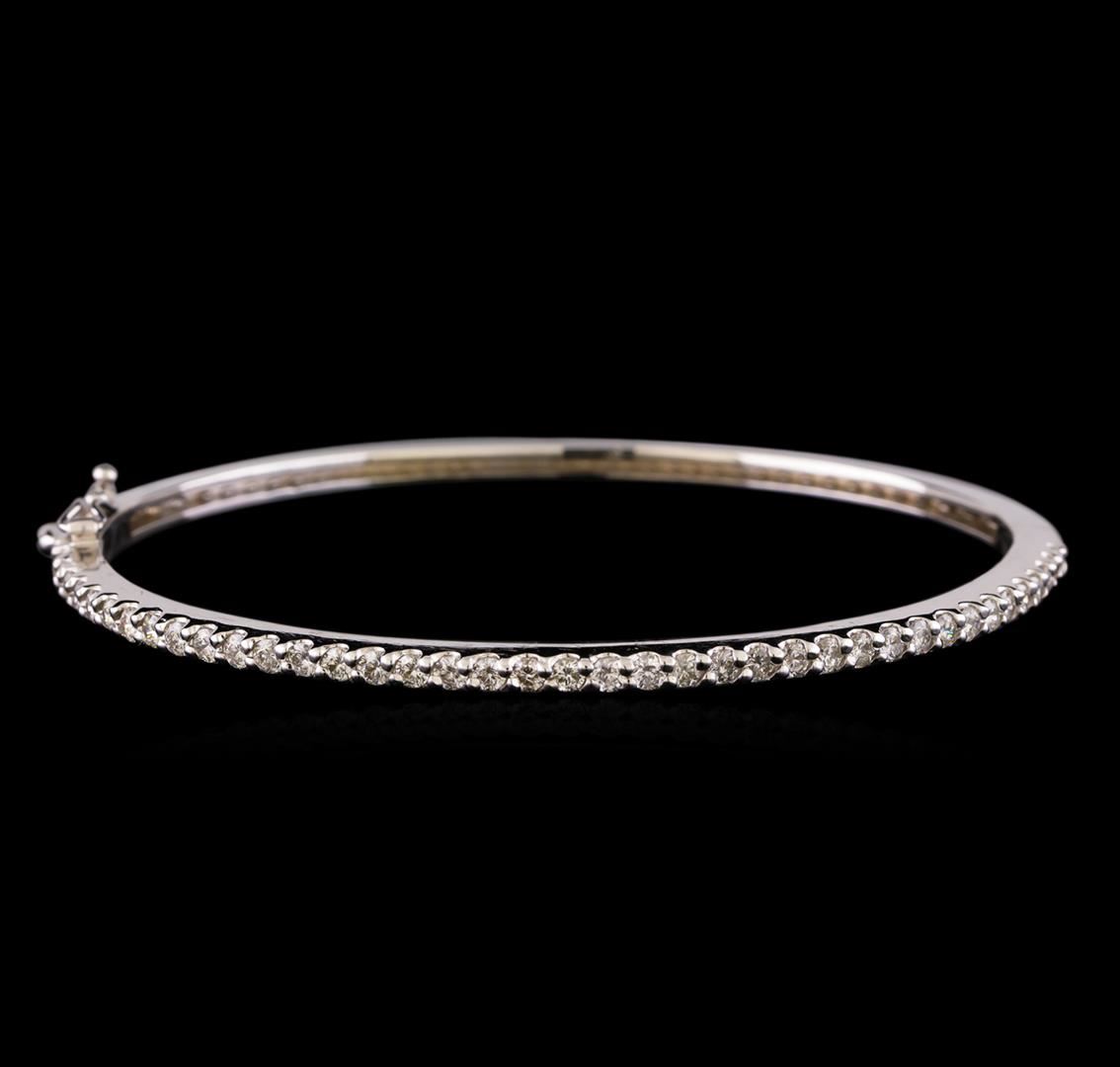 One electronically tested 14KT white gold ladies cast diamond bangle bracelet with a hidden box clasp with a bright polish finish. Identified with markings of "14K". Condition is new. Containing: Thirty-Nine prong set round brilliant cut diamonds, measuring 2.10 - 2.10 x 1.26mm (depth est.) approximate total weight of 39 Stones = 1.32ct. Clarity: SI-2 to I-1. Color: I - J, Cut is Good. All diamonds are graded in the mounting, unless otherwise stated. Total Weight of Diamonds 1.32ct. Total Weight of Bangle Bracelet 11.50 grams. GGL Appraised at $4,945.00.